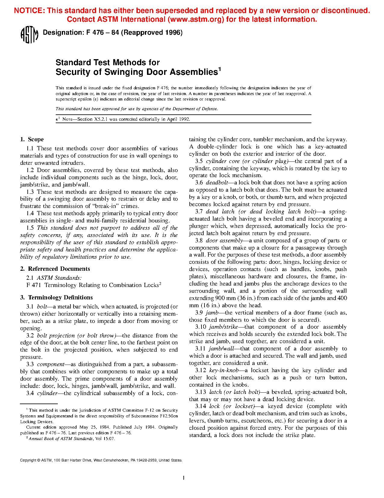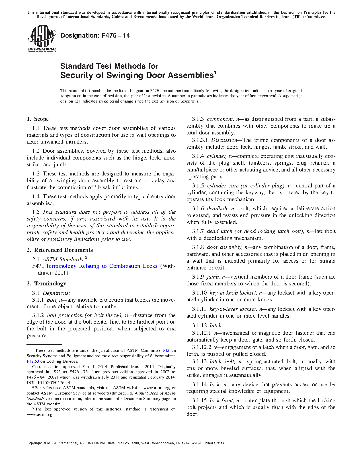 1.2 Door assemblies, covered by these test methods, also include individual components such as the hinge, lock, door, jamb/strike, and jamb/wall.