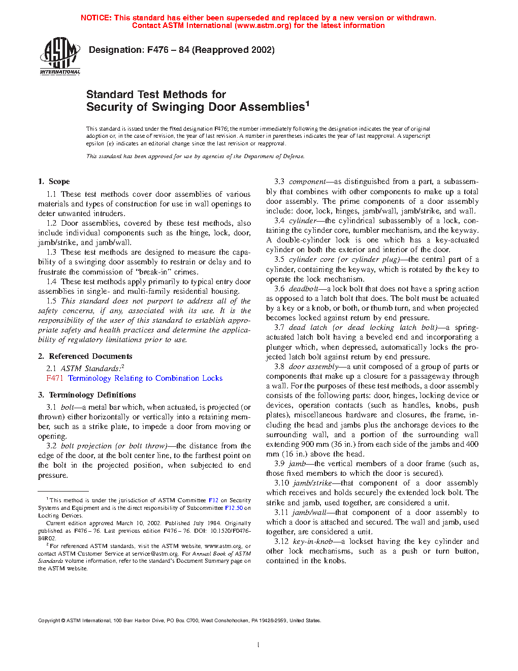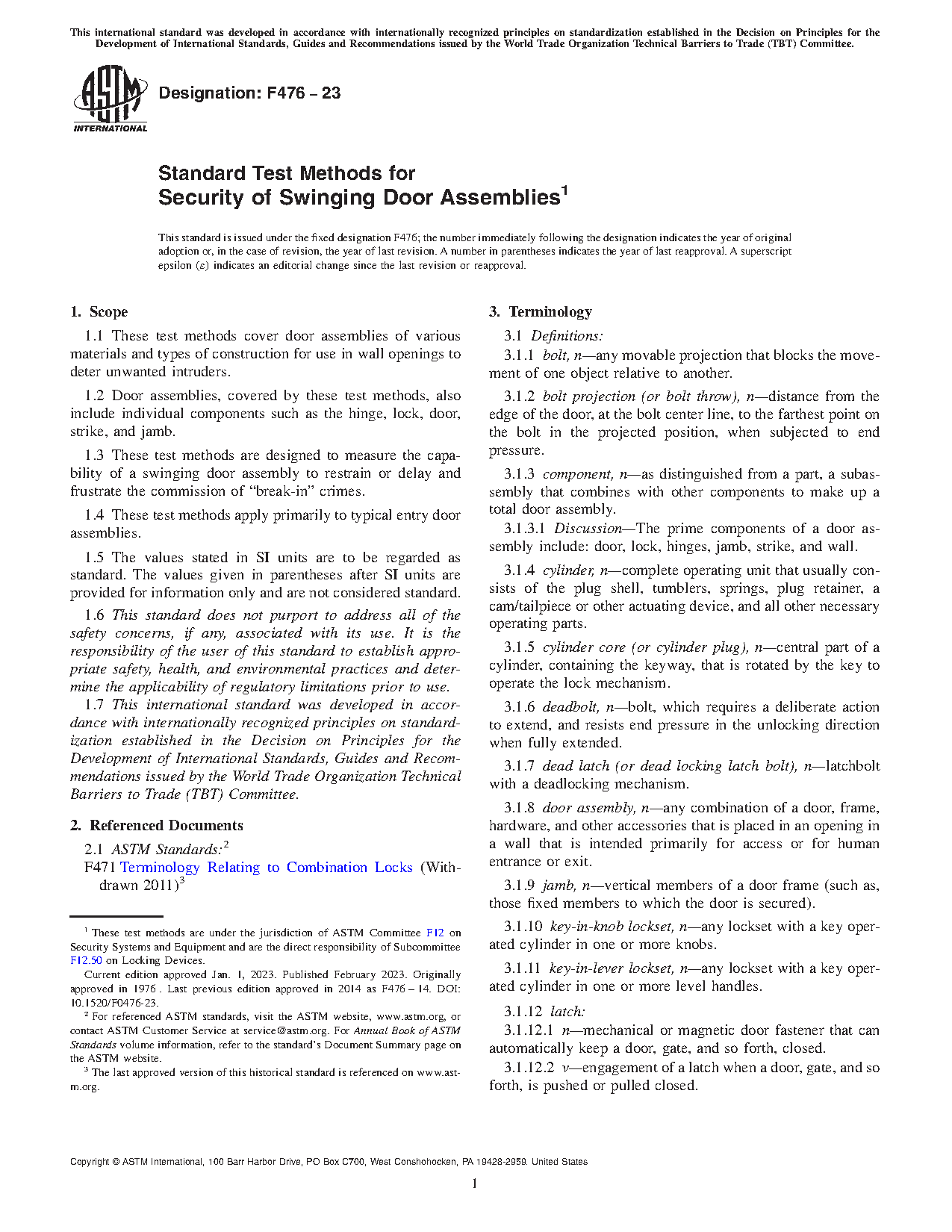 1.3 These test methods are designed to measure the capability of a swinging door assembly to restrain or delay and to frustrate the commission of "break-in" crimes.