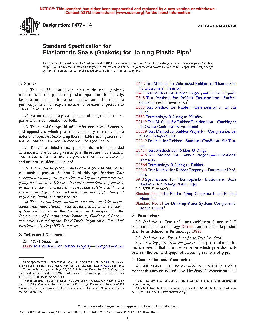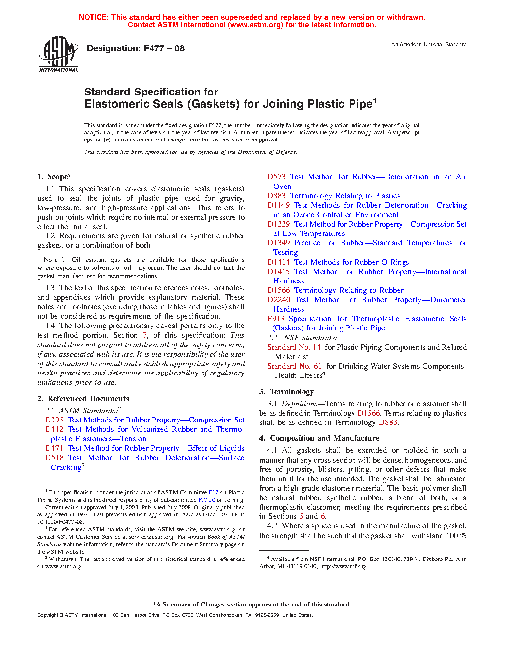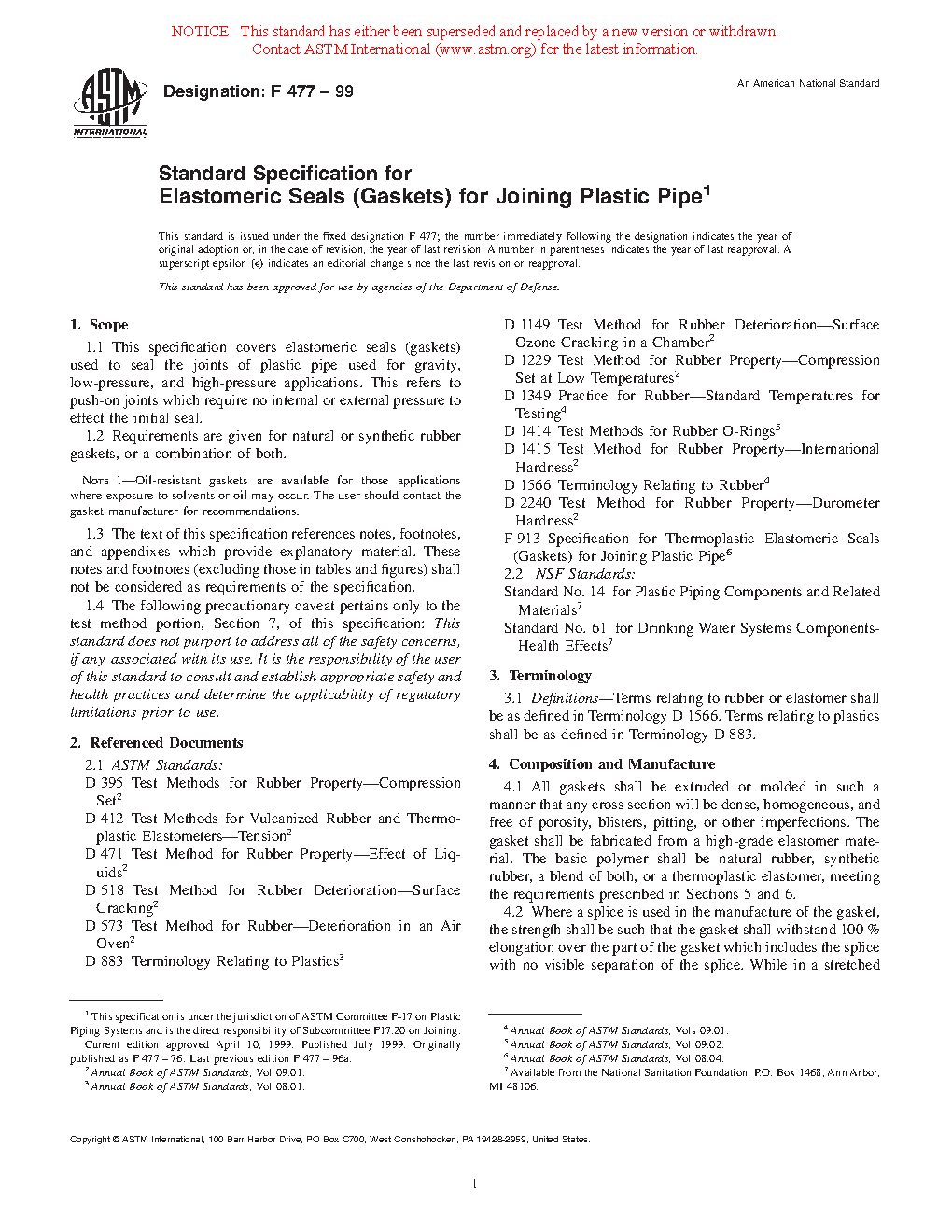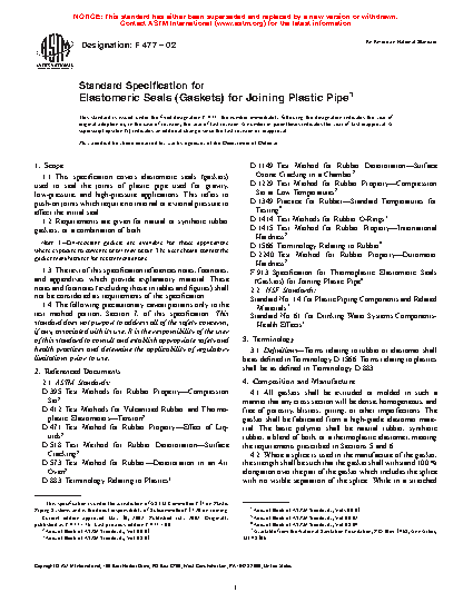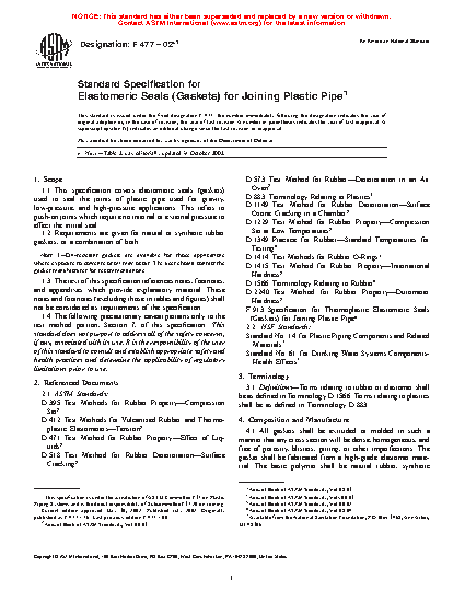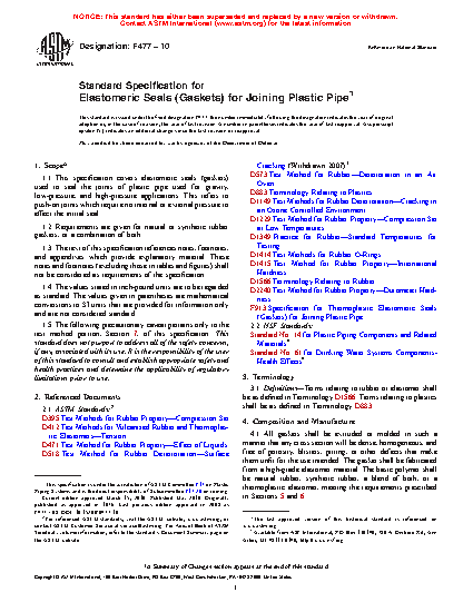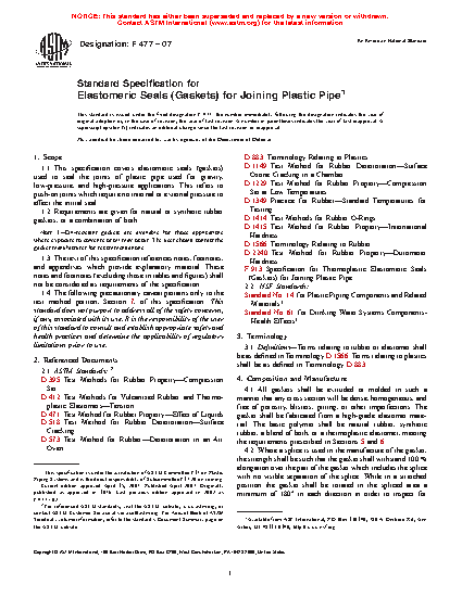 This specification covers elastomeric seals (gaskets) used to seal the joints of plastic pipe used for gravity, low-pressure, and high-pressure applications. This refers to push-on joints which require no internal or external pressure to effect the initial seal. Tensile strength, elongation, hardness, compression set, accelerated aging, water immersion, ozone resistance, and force decay shall be tested to meet the requirements prescribed.