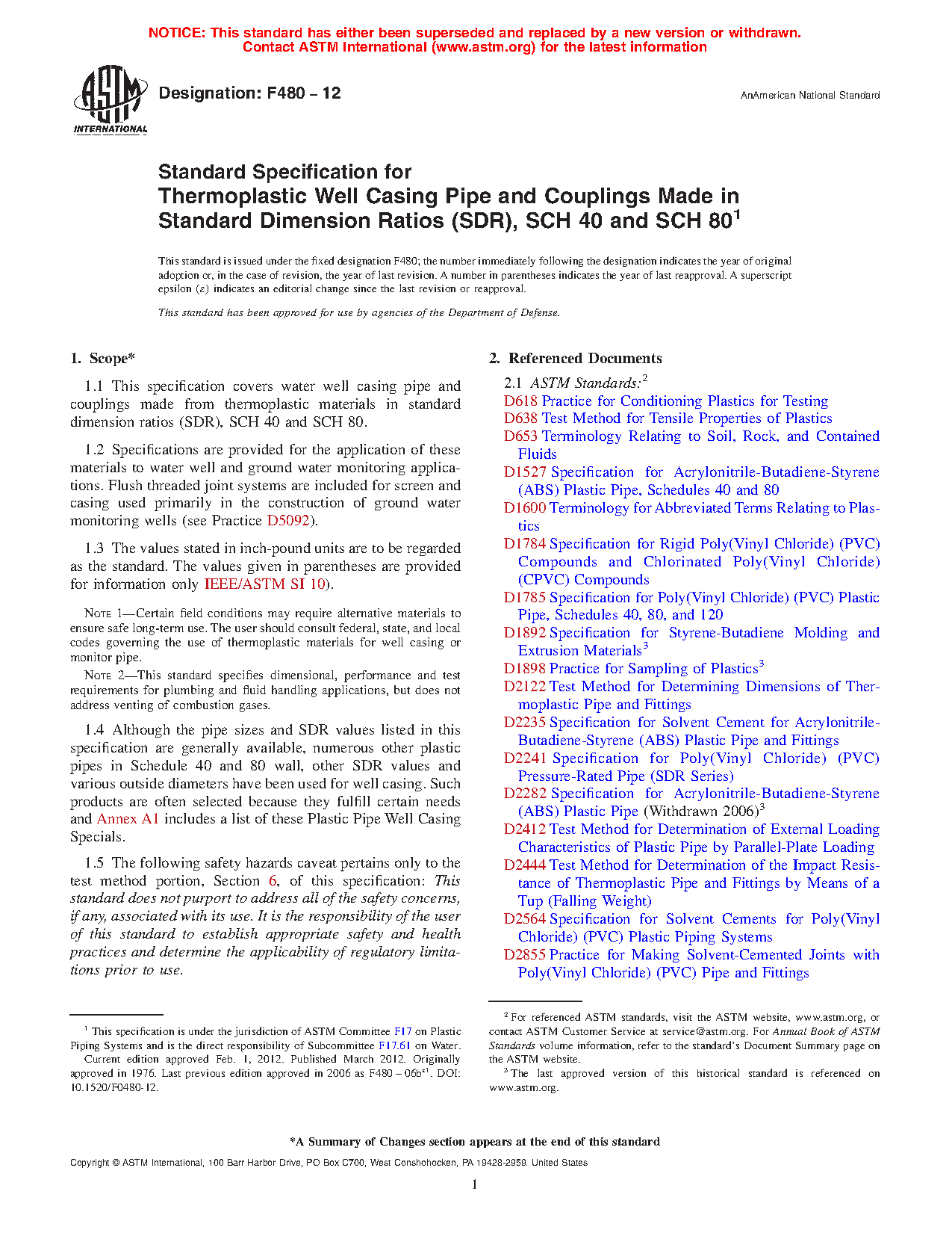 1.4 Although the pipe sizes and SDR values listed in this specification are generally available, numerous other plastic pipes in Schedule 40 and 80 wall, other SDR values and various outside diameters have been used for well casing. Such products are often selected because they fulfill certain needs and Annex A1 includes a list of these Plastic Pipe Well Casing Specials.