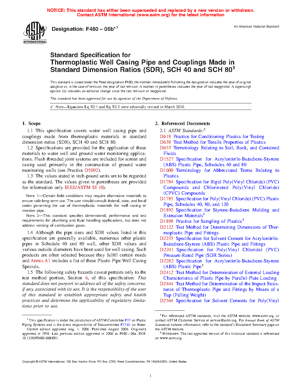 1.1 This specification covers water well casing pipe and couplings made from thermoplastic materials in standard dimension ratios (SDR), SCH 40 and SCH 80.