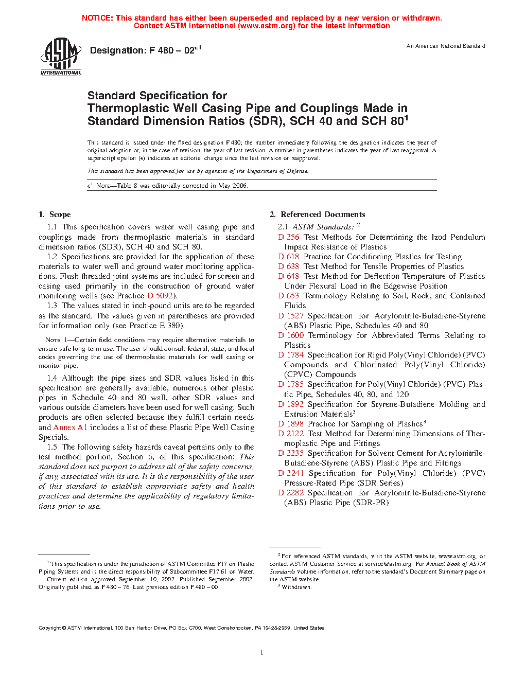1.1 This specification covers water well casing pipe and couplings made from thermoplastic materials in standard dimension ratios (SDR), SCH 40 and SCH 80.