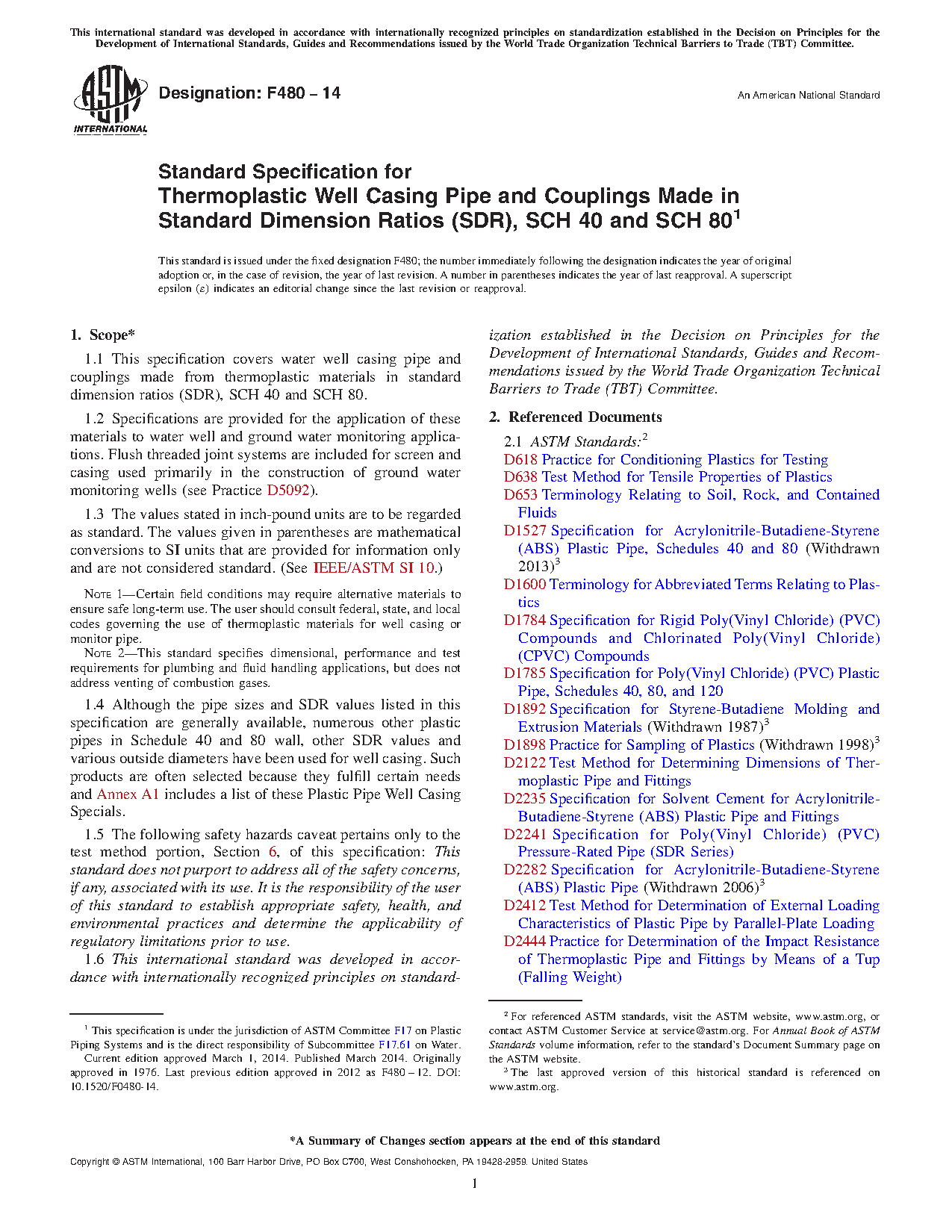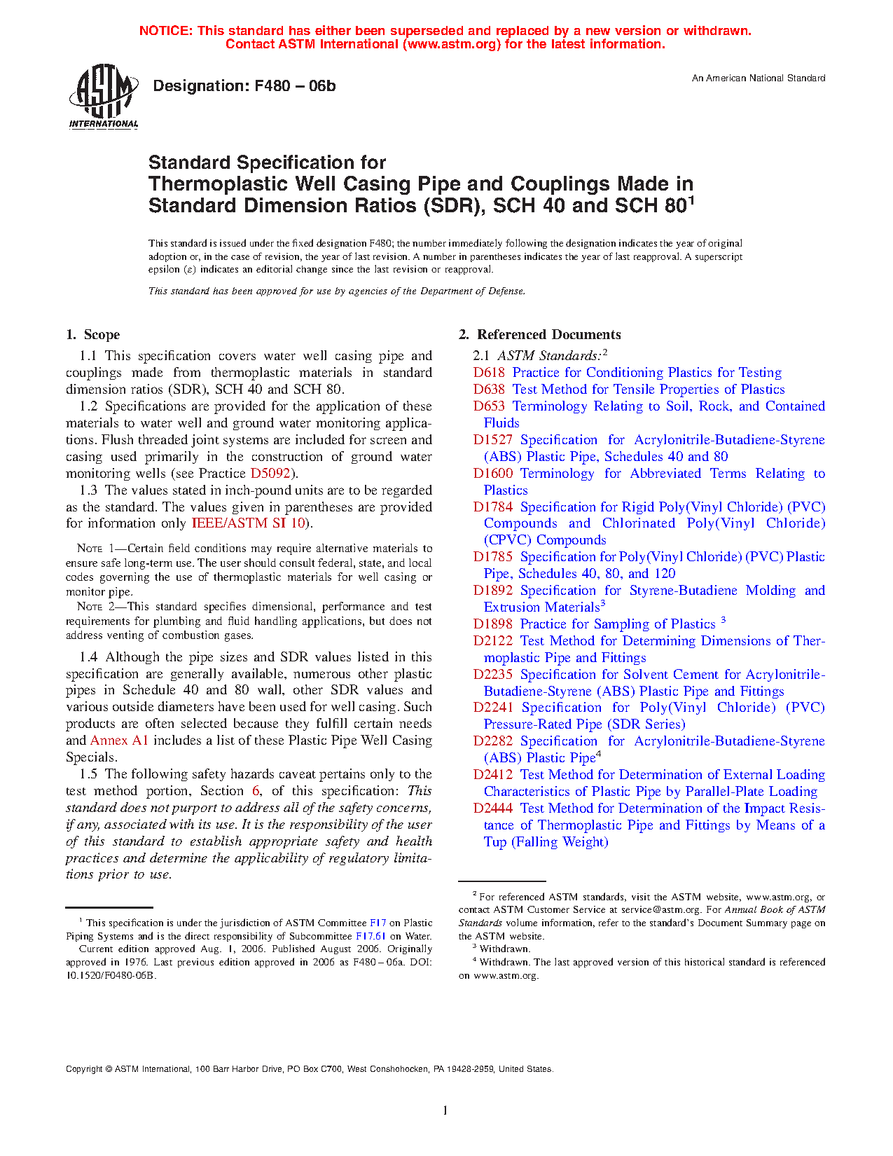 1.4 Although the pipe sizes and SDR values listed in this specification are generally available, numerous other plastic pipes in Schedule 40 and 80 wall, other SDR values and various outside diameters have been used for well casing. Such products are often selected because they fulfill certain needs and Annex A1 includes a list of these Plastic Pipe Well Casing Specials.