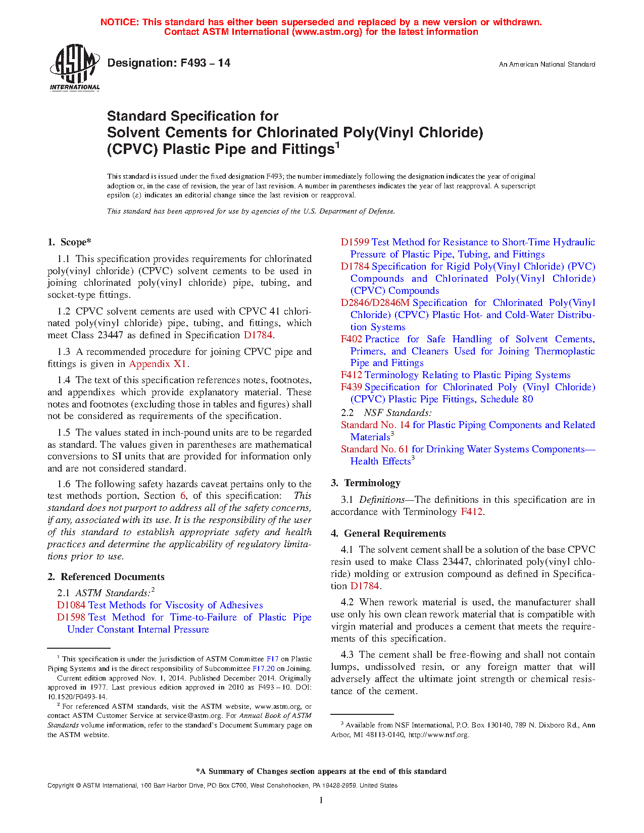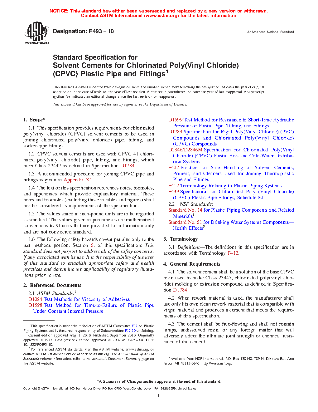 1.2 CPVC solvent cements are used with CPVC 41 chlorinated poly(vinyl chloride) pipe, tubing, and fittings, which meet Class 23447 as defined in Specification D1784.
