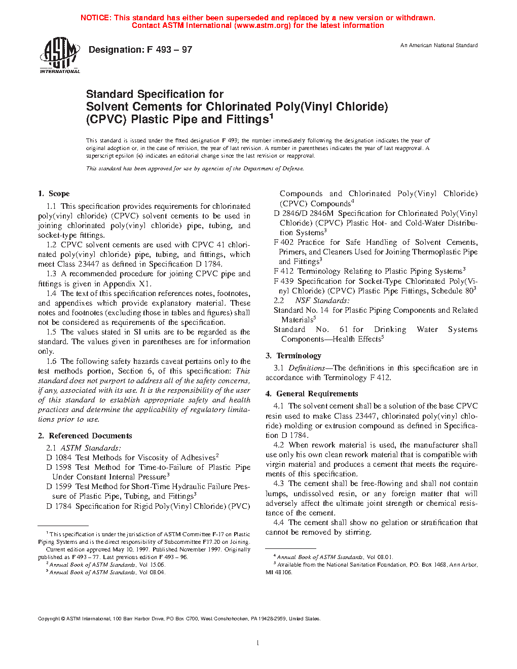 1.1 This specification provides requirements for chlorinated poly(vinyl chloride) (CPVC) solvent cements to be used in joining chlorinated poly(vinyl chloride) pipe, tubing, and socket-type fittings.