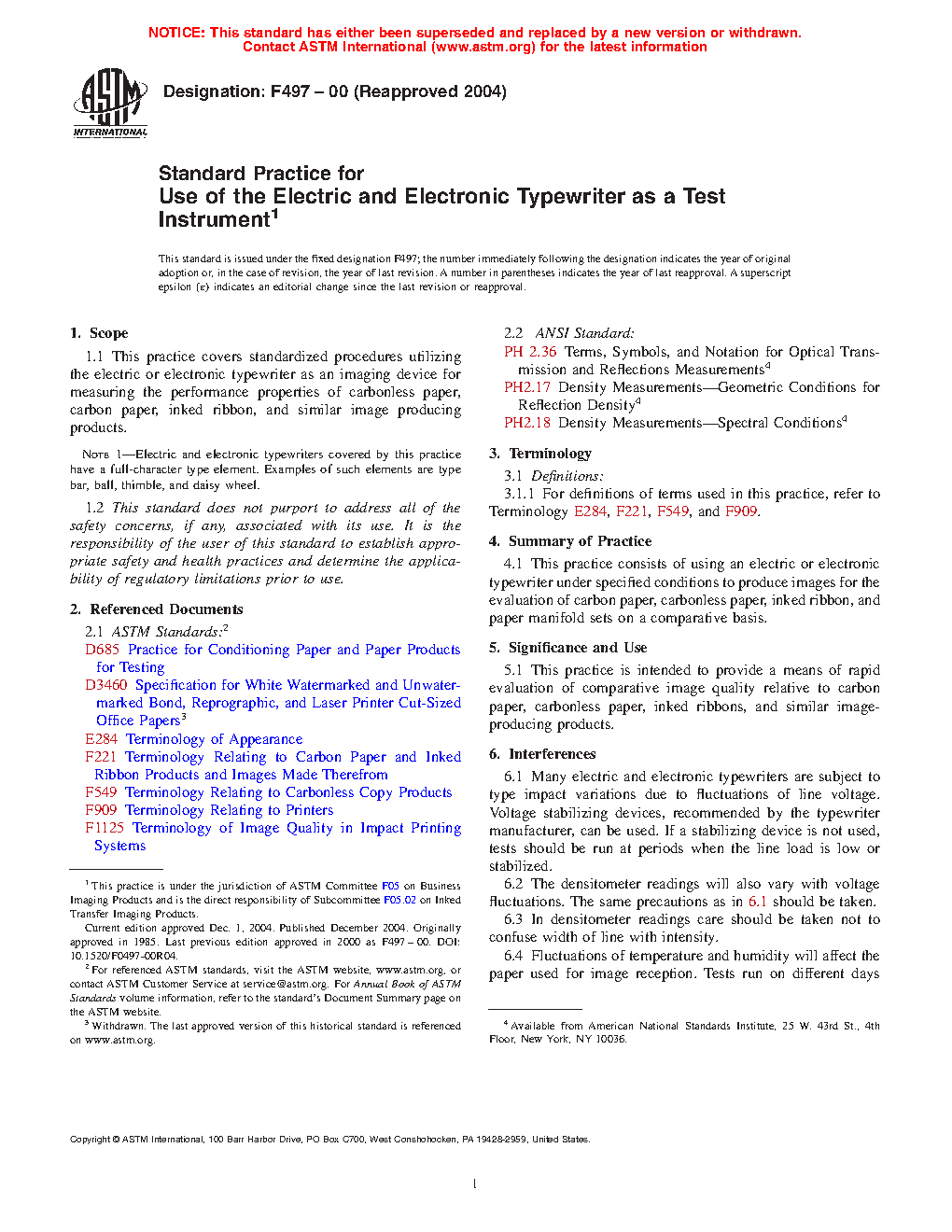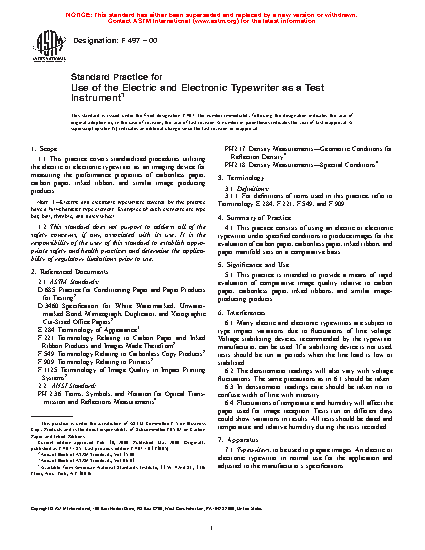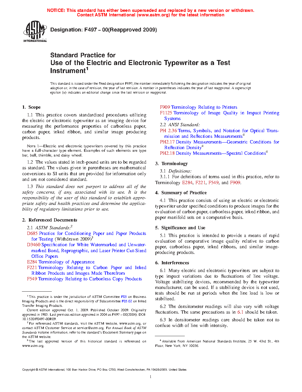 1.1 This practice covers standardized procedures utilizing the electric or electronic typewriter as an imaging device for measuring the performance properties of carbonless paper, carbon paper, inked ribbon, and similar image producing products.
