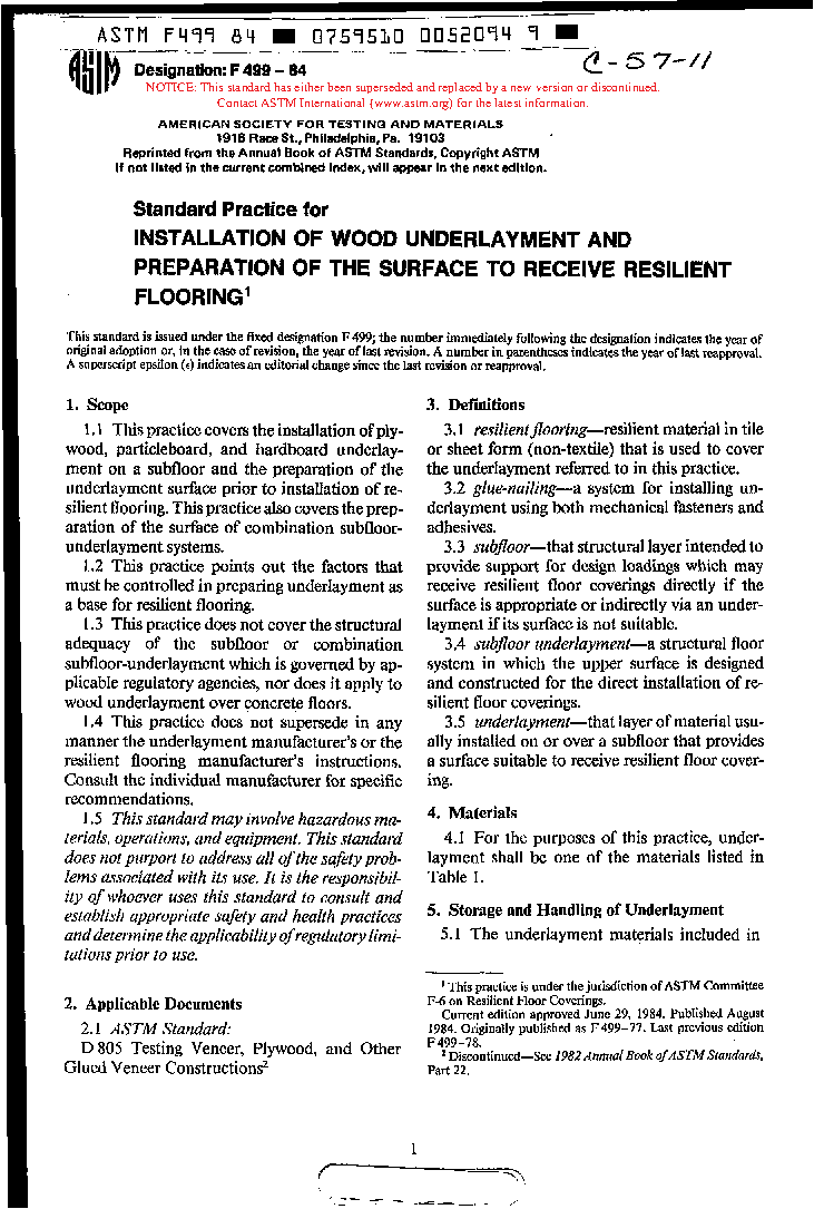 Recommended Practice for Installation of Wood Underlayment and Preparation of the Surface to Receive Resilient Flooring (Withdrawn 1992)