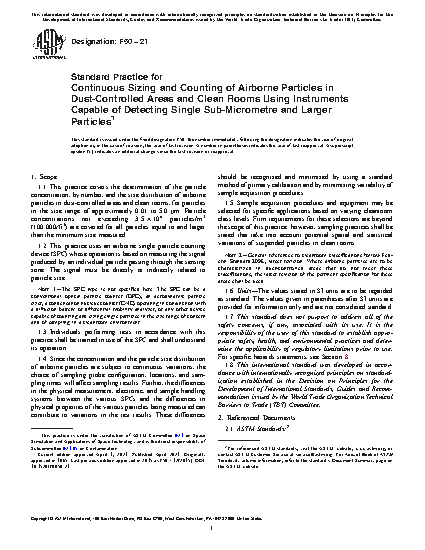 1.1 This practice covers the determination of the particle concentration, by number, and the size distribution of airborne particles in dust-controlled areas and clean rooms, for particles in the size range of approximately 0.01 to 5.0 [mu]m. Particle concentrations not exceeding 3.5 X 106 particles/m3 (100 000/ft3) are covered for all particles equal to and larger than the minimum size measured.