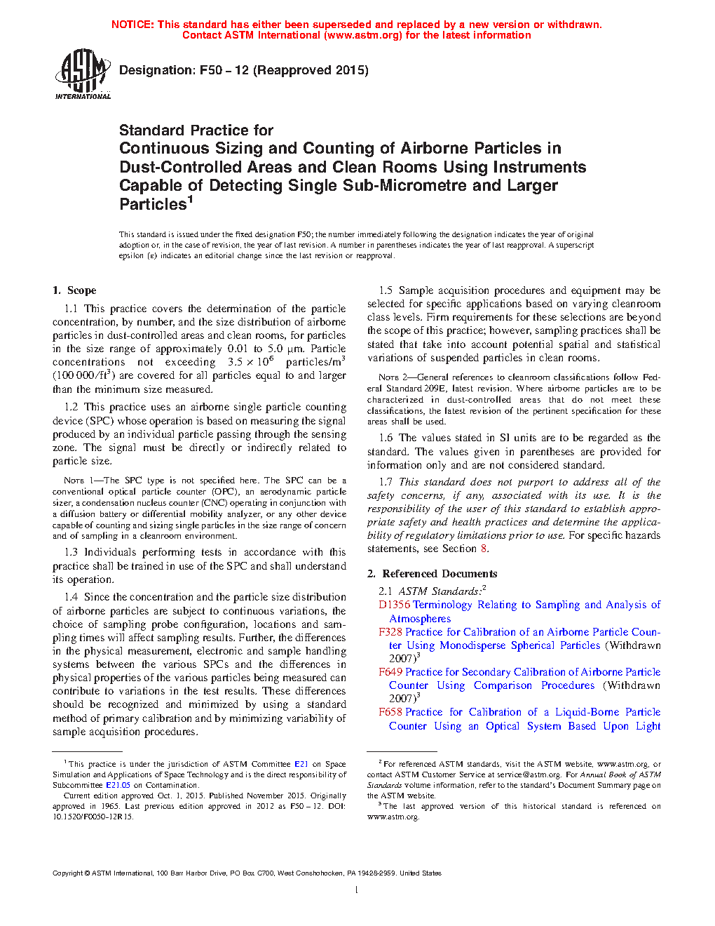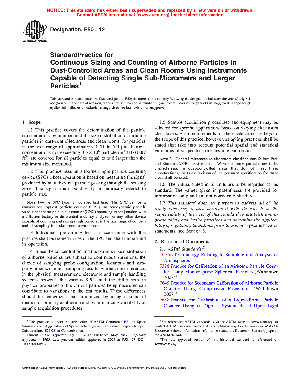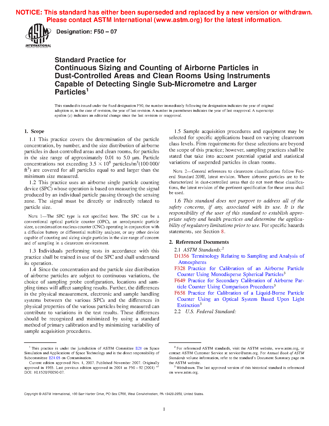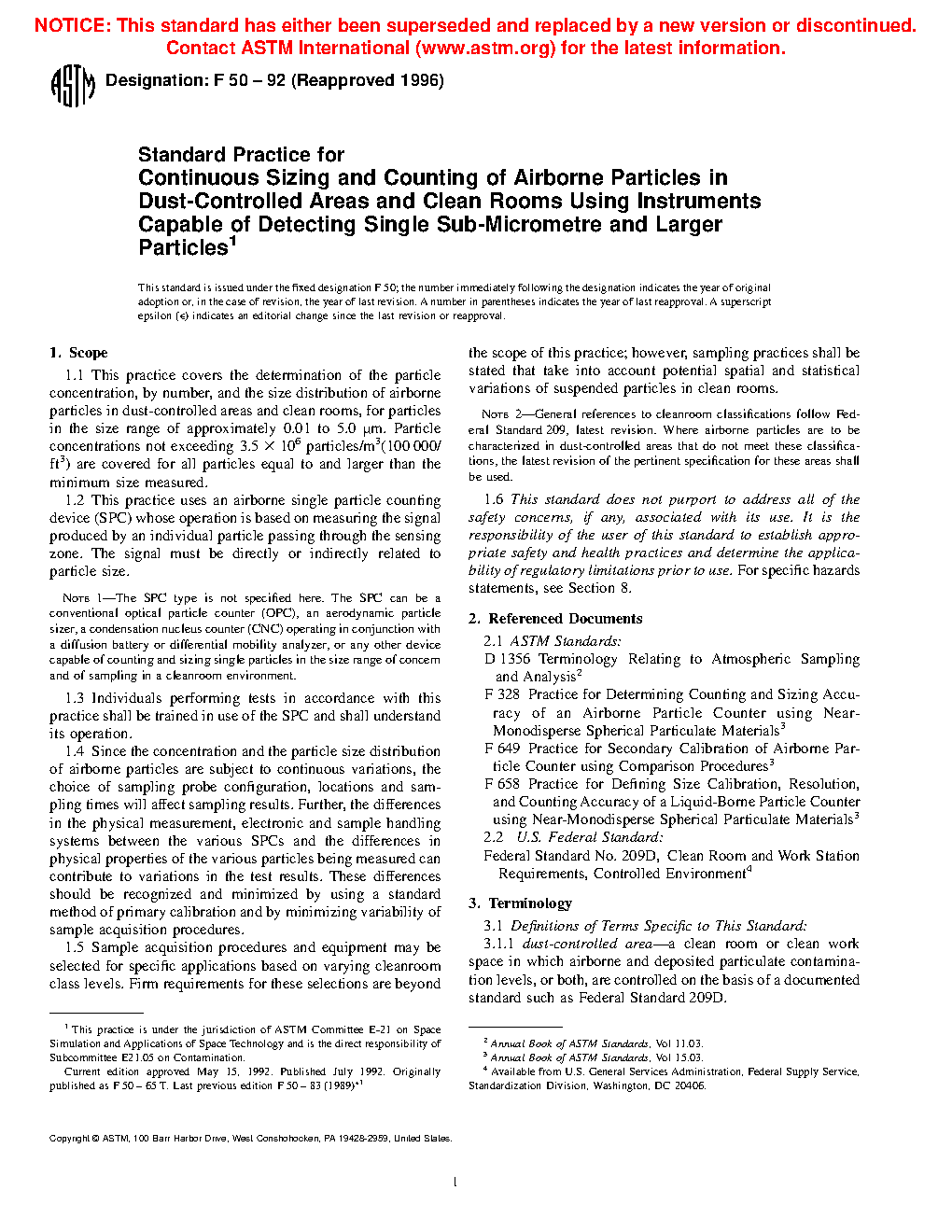 Note 2-General references to cleanroom classifications follow Federal Standard 209, latest revision. Where airborne particles are to be characterized in dust-controlled areas that do not meet these classifications, the latest revision of the pertinent specification for these areas shall be used.1.6 This standard does not purport to address all of the safety concerns, if any, associated with its use. It is the responsibility of the user of this standard to establish appropriate safety and health practices and determine the applicability of regulatory limitations prior to use. For specific hazards statements, see Section 8.