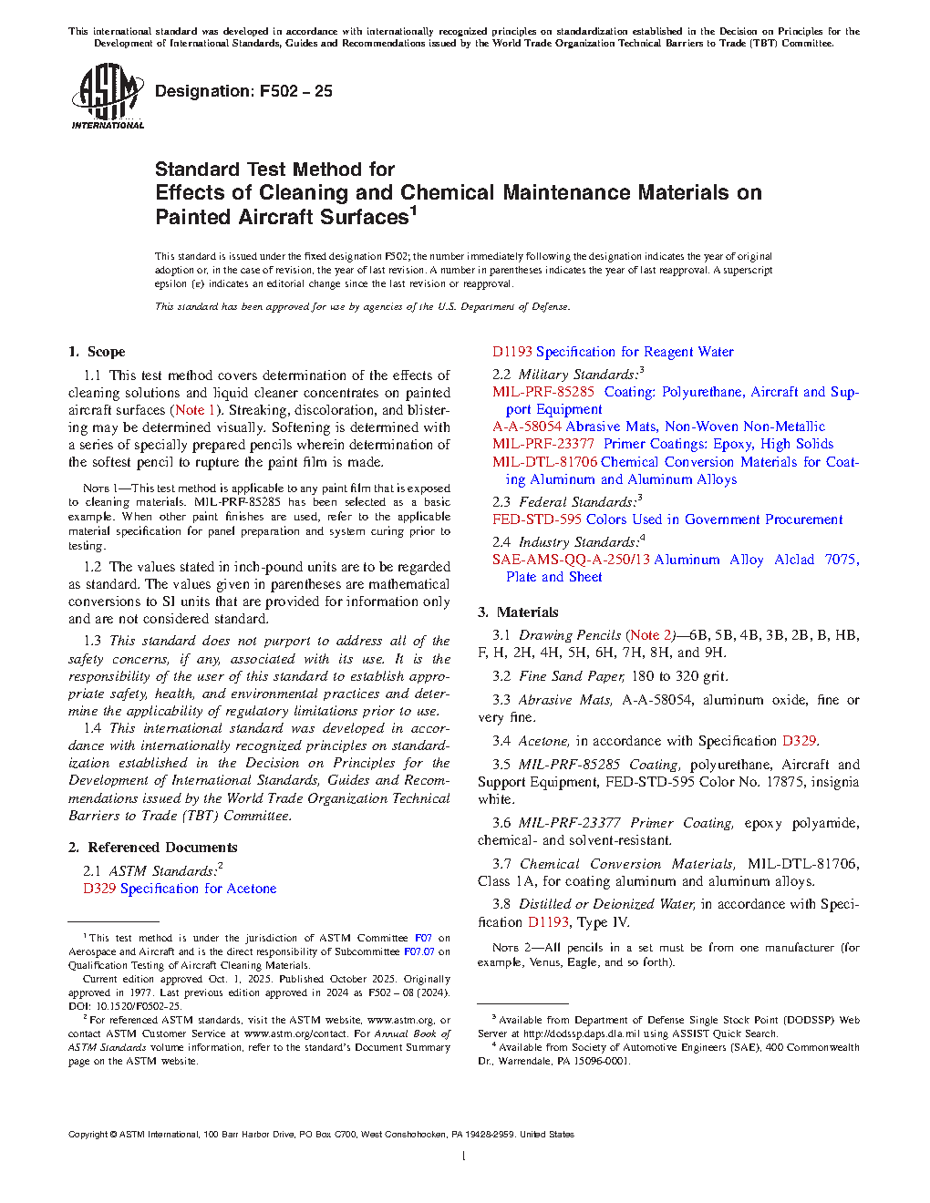 Note 1—This test method is applicable to any paint film that is exposed to cleaning materials. MIL-PRF-85285 has been selected as a basic example. When other paint finishes are used, refer to the applicable material specification for panel preparation and system curing prior to testing.