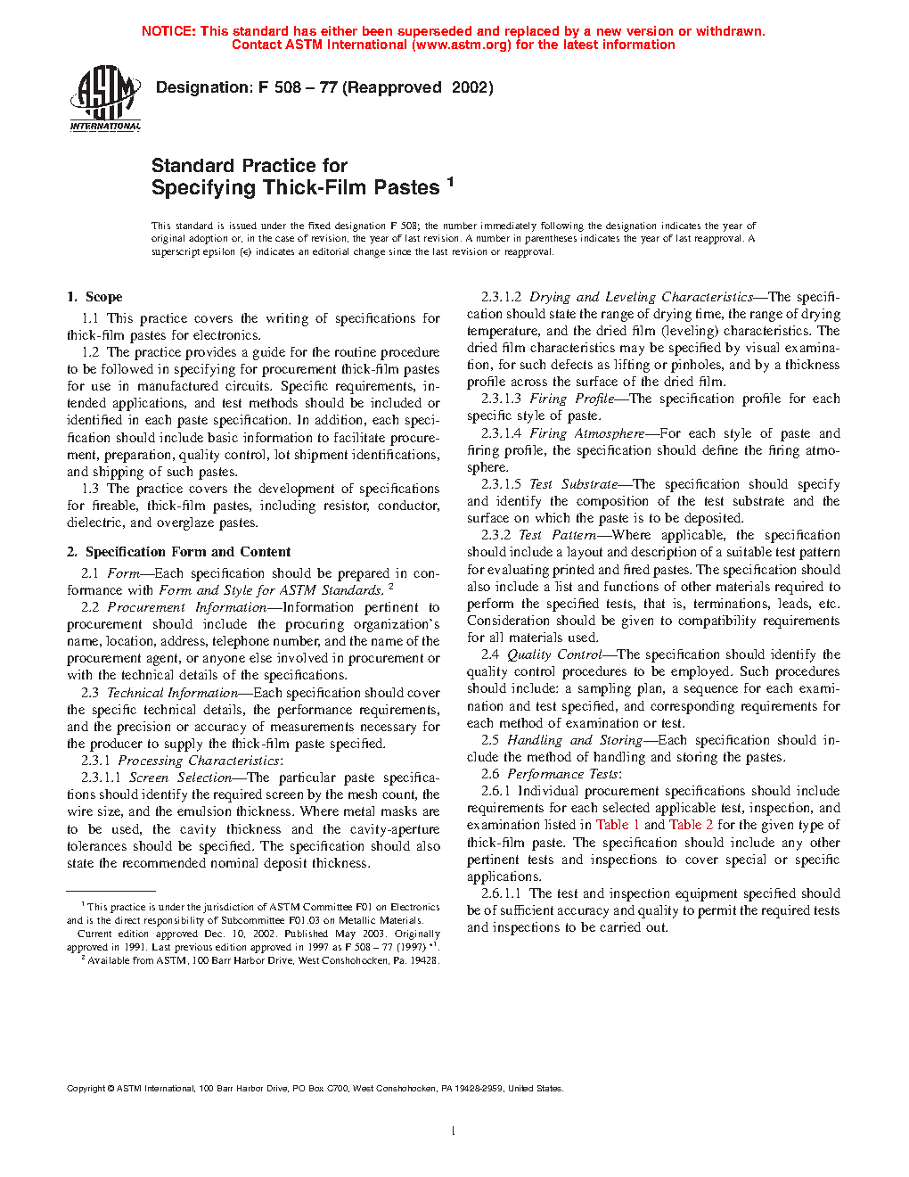 1.2 The practice provides a guide for the routine procedure to be followed in specifying for procurement thick-film pastes for use in manufactured circuits. Specific requirements, intended applications, and test methods should be included or identified in each paste specification. In addition, each specification should include basic information to facilitate procurement, preparation, quality control, lot shipment identifications, and shipping of such pastes.