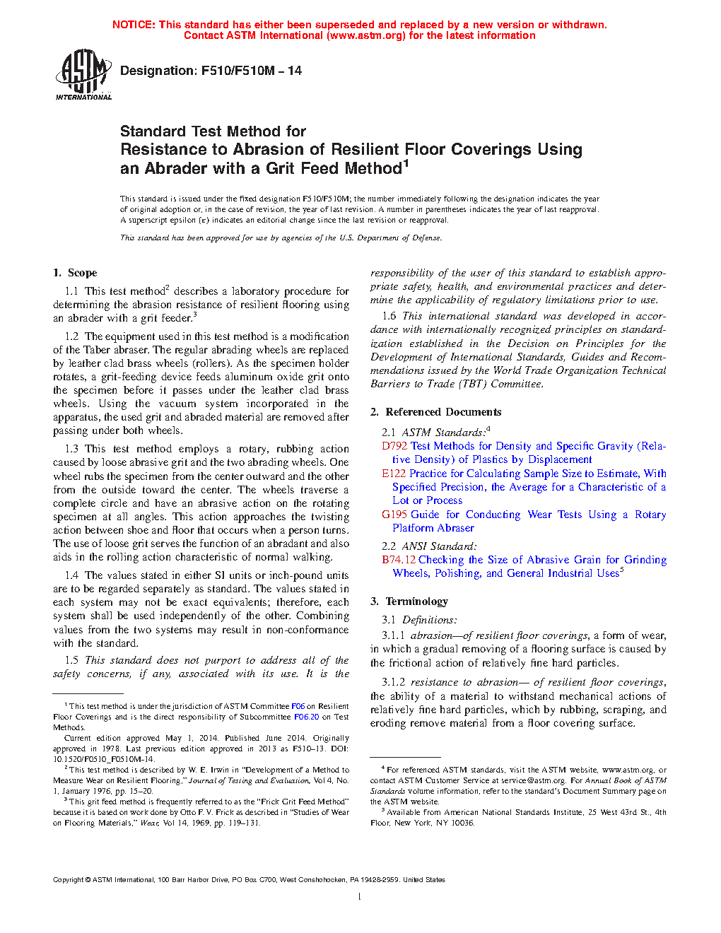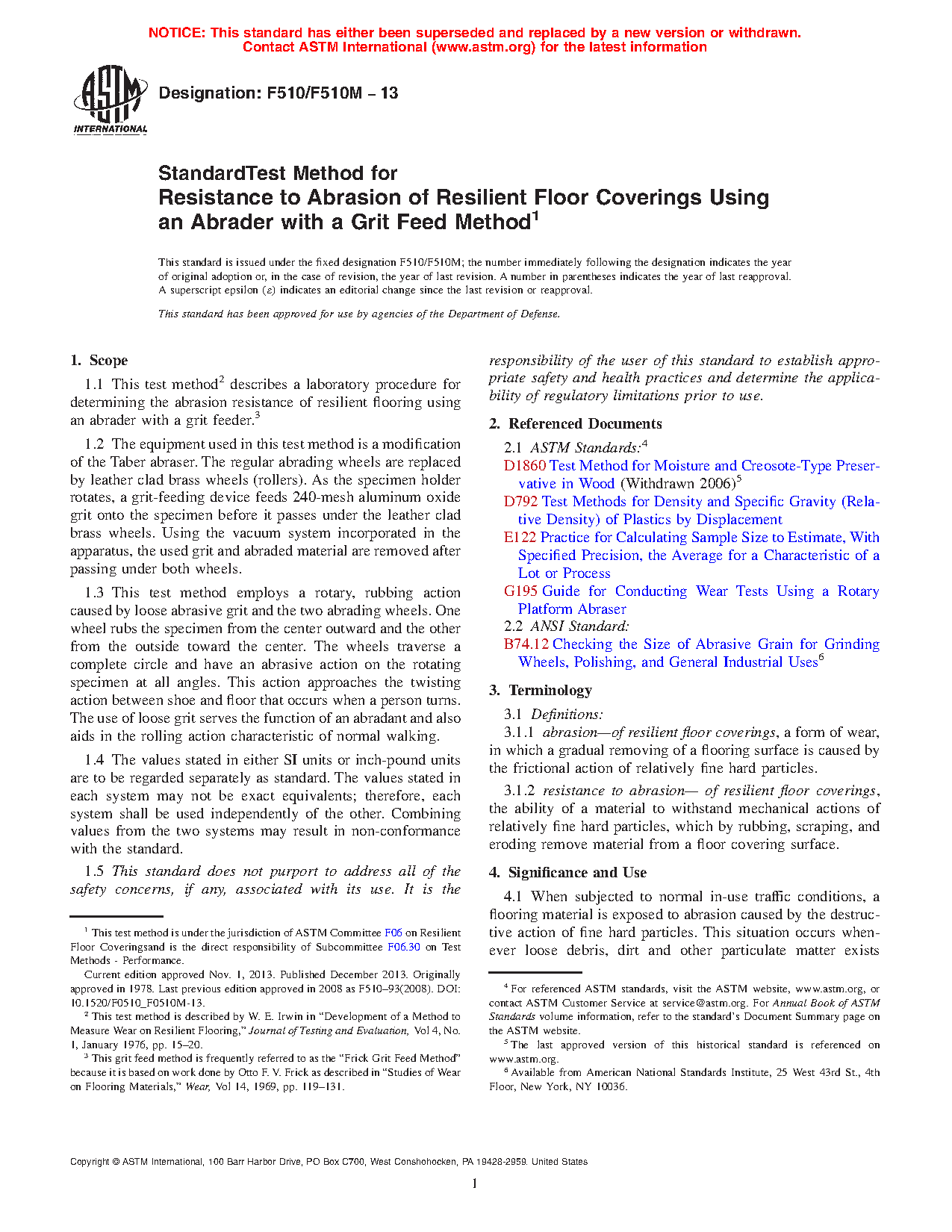 4.1 When subjected to normal in-use traffic conditions, a flooring material is exposed to abrasion caused by the destructive action of fine hard particles. This situation occurs whenever loose debris, dirt and other particulate matter exists between traffic bodies (that is, shoes and a flooring surface). Under continuing exposure to an “abrasive action,” a flooring material may suffer a thickness loss sufficient to reduce its service life.
