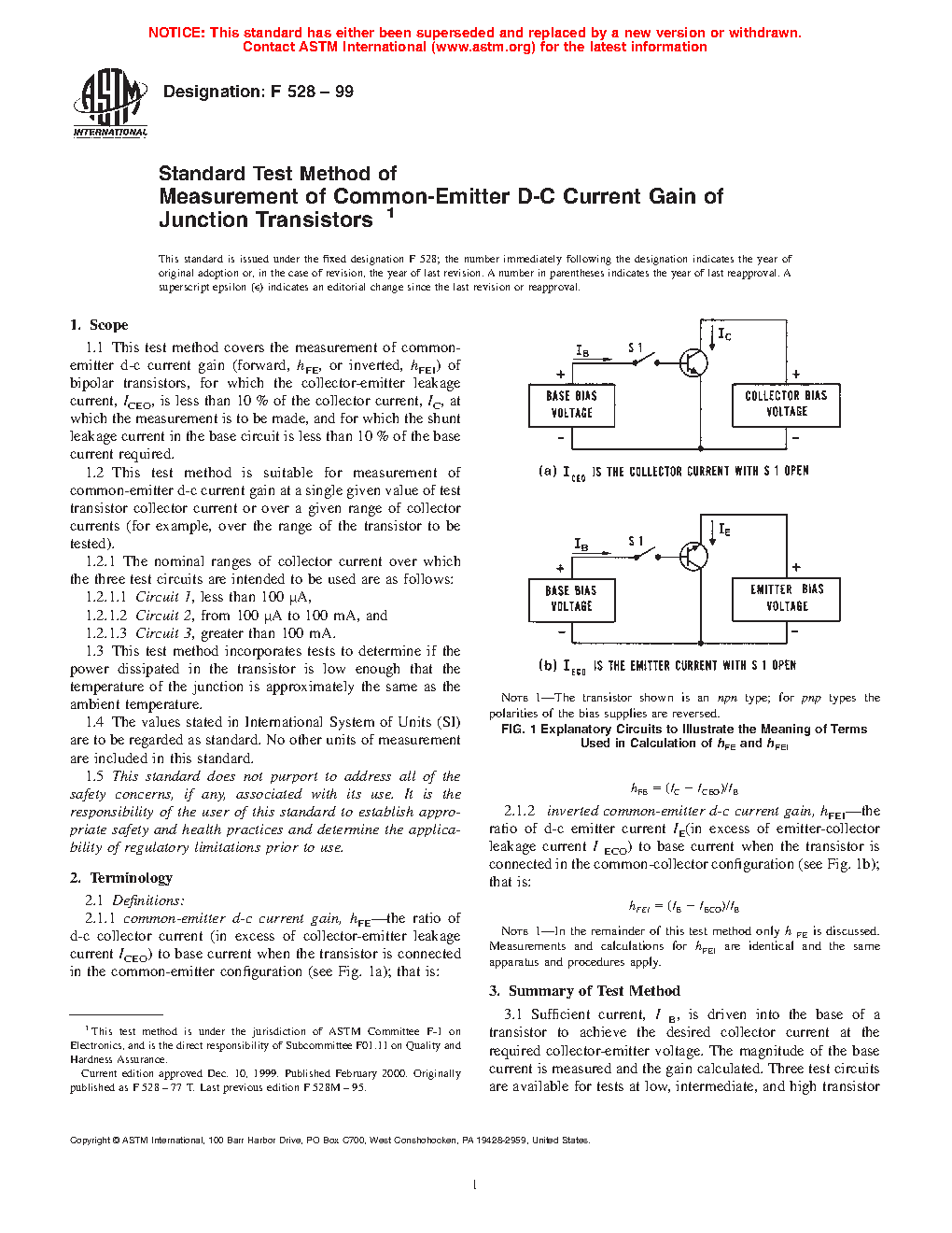 1.1 This test method covers the measurement of common-emitter d-c current gain (forward, hFE, or inverted, hFEI) of bipolar transistors, for which the collector-emitter leakage current, ICEO, is less than 10% of the collector current, IC, at which the measurement is to be made, and for which the shunt leakage current in the base circuit is less than 10% of the base current required.