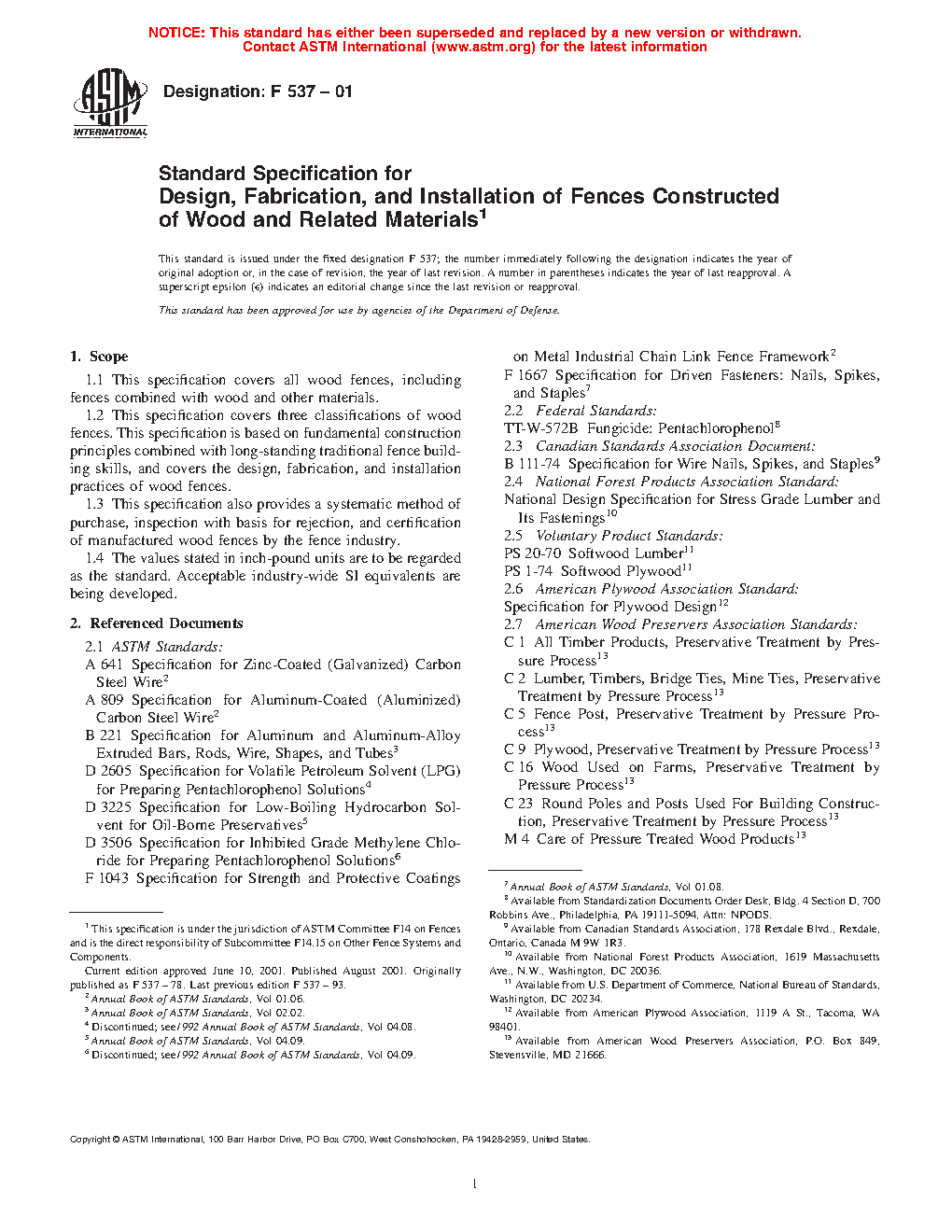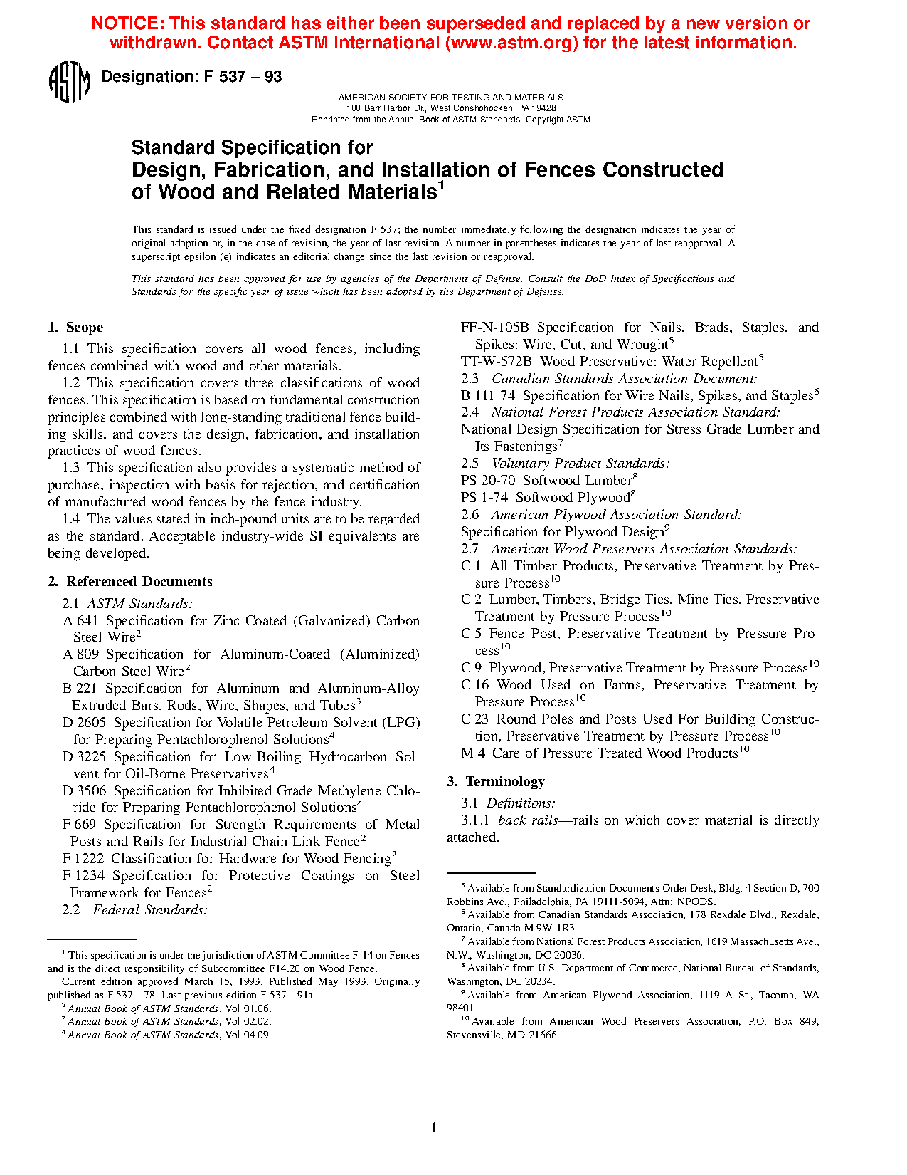 1.2 This specification covers three classifications of wood fences. This specification is based on fundamental construction principles combined with long-standing traditional fence building skills, and covers the design, fabrication, and installation practices of wood fences.