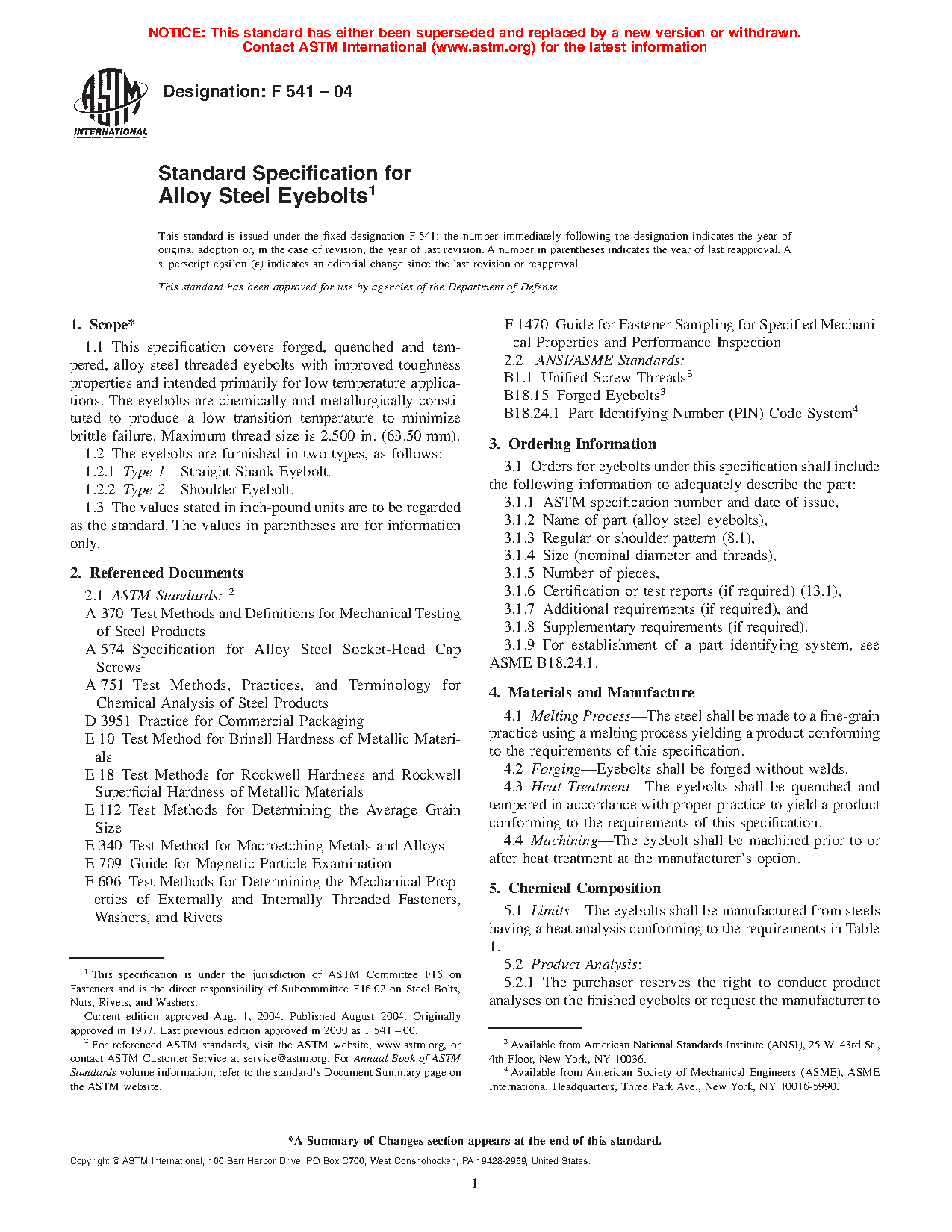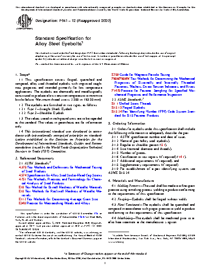 1.1 This specification covers forged, quenched and tempered, alloy steel threaded eyebolts with improved toughness properties and intended primarily for low temperature applications. The eyebolts are chemically and metallurgically constituted to produce a low transition temperature to minimize brittle failure. Maximum thread size is 2.500 in. (63.50 mm).