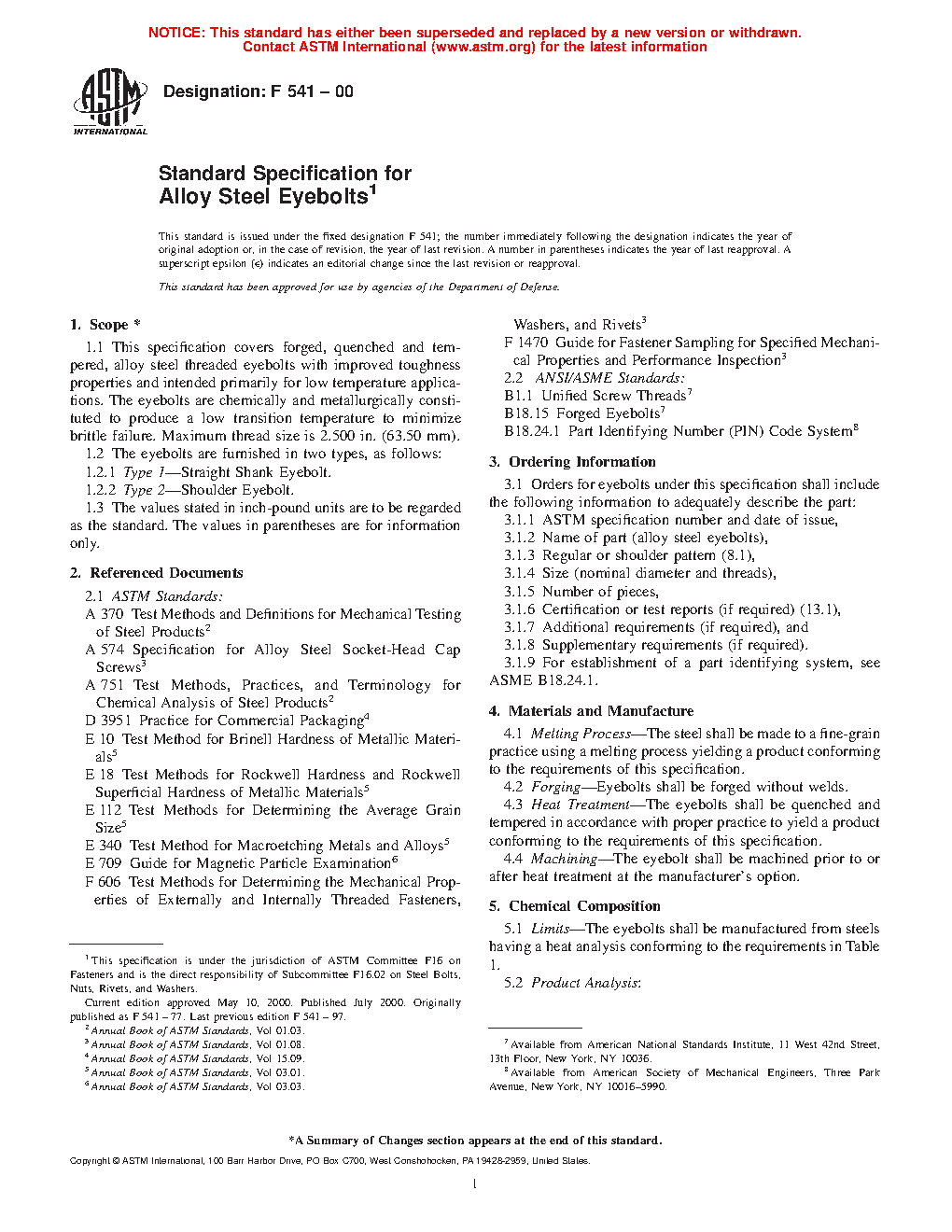 This specification covers the basic requirements and corresponding test methods for forged, quenched, and tempered, alloy steel threaded eyebolts with improved toughness properties and that are chemically and metallurgically constituted to produce a low transition temperature to minimize brittle failure, intended primarily for low temperature applications. The eyebolts are furnished either as straight shank eyebolts (Type 1), or shoulder eyebolts (Type 2). Sampled specimens shall be tested, and conform accordingly to chemical (carbon, manganese, phosphorus, sulfur, silicon, chromium, molybdenum, and nickel), metallurgical (grain size, decarburization, and macrotech properties), and mechanical (Brinell hardness, tensile strength, breaking strength, proof load, impact strength, and bend strength) requirements.