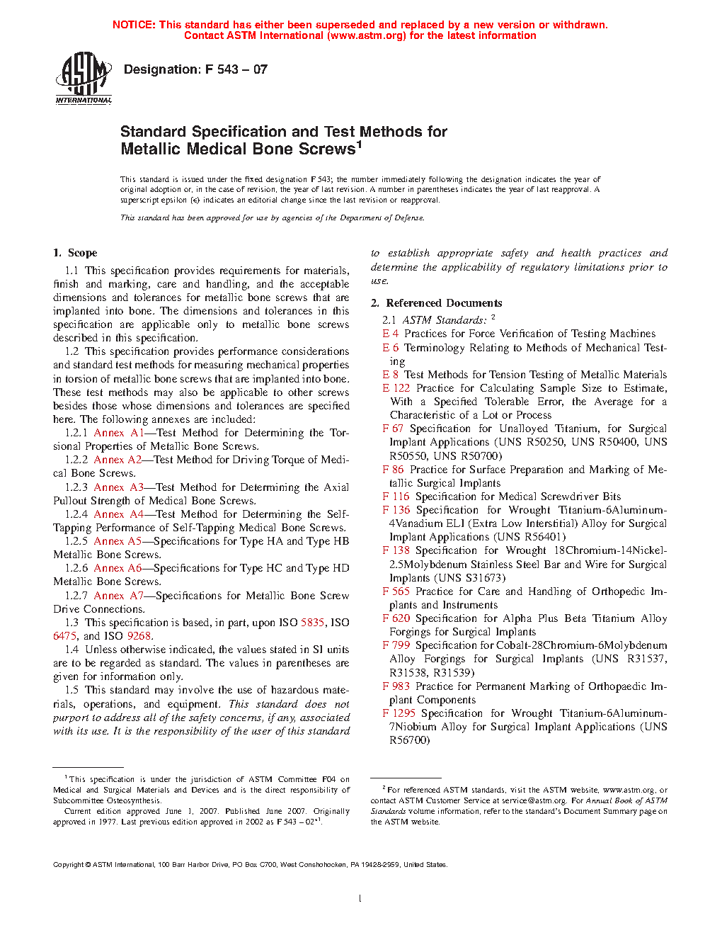1.2 This specification provides performance considerations and standard test methods for measuring mechanical properties in torsion of metallic bone screws that are implanted into bone. These test methods may also be applicable to other screws besides those whose dimensions and tolerances are specified here. The following annexes are included: