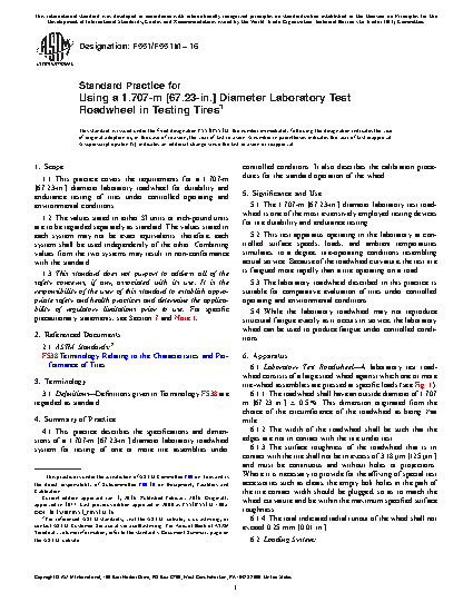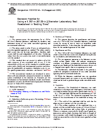 1.1 This practice covers the requirements for a 1.707-m [67.23-in.] diameter laboratory roadwheel for durability and endurance testing of tires under controlled operating and environmental conditions.