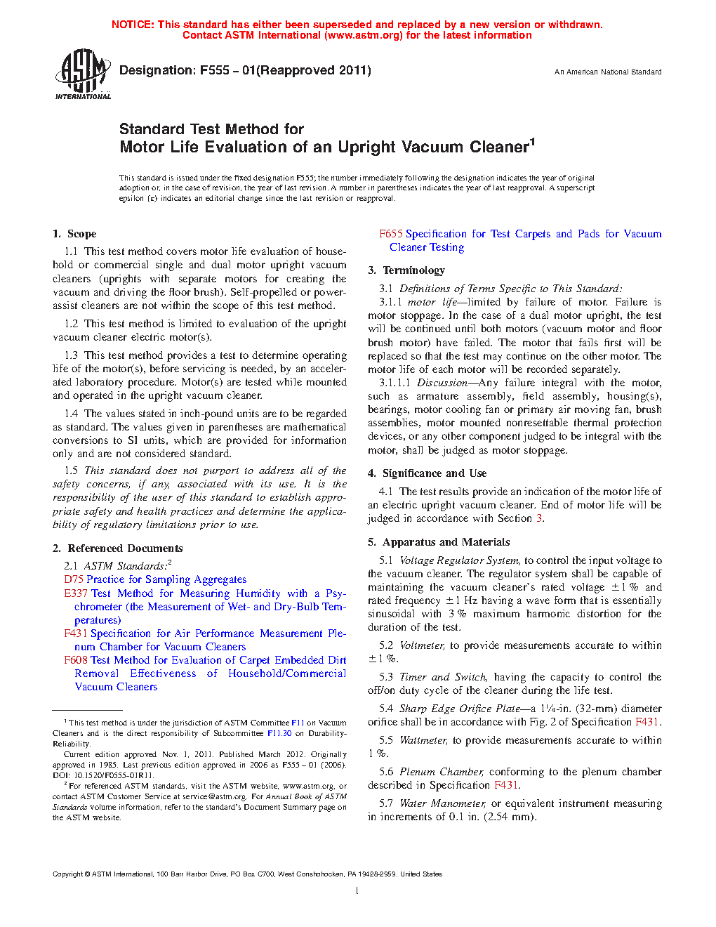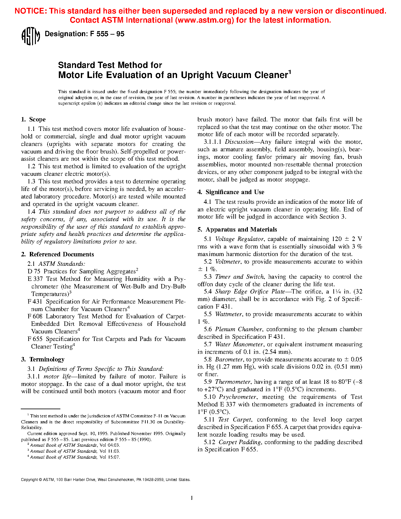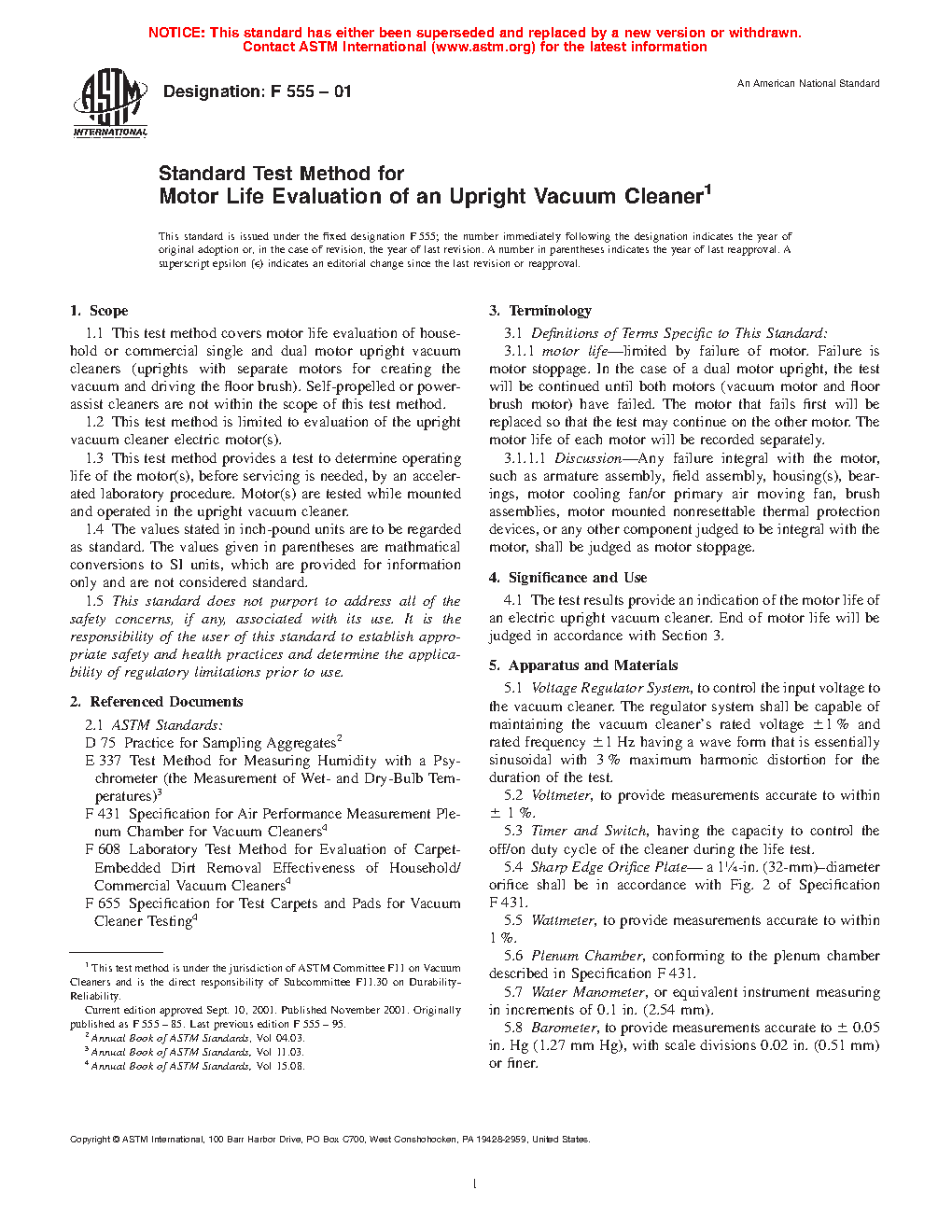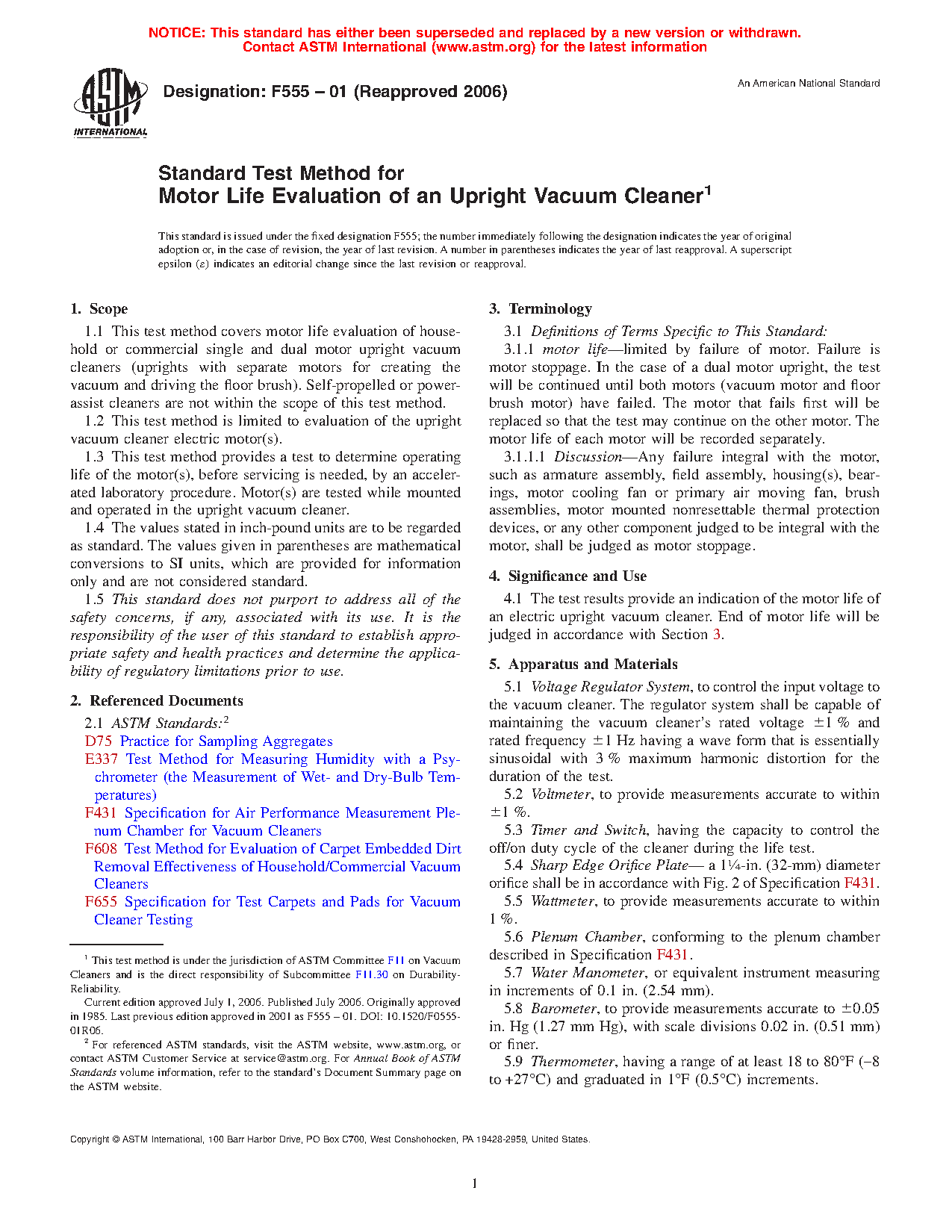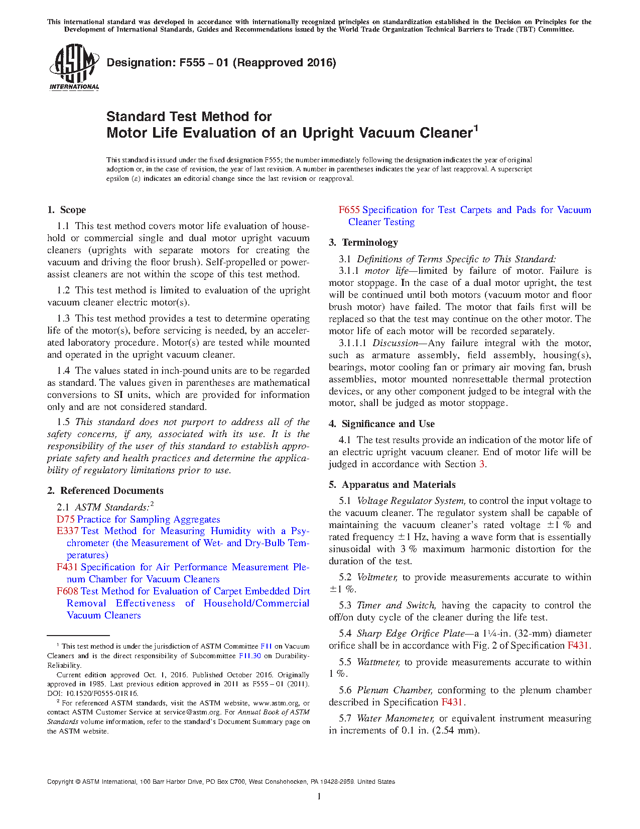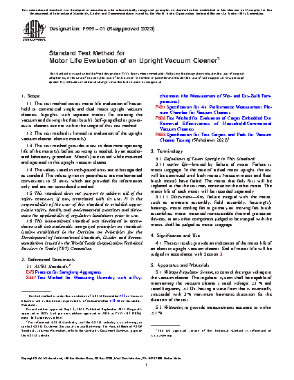 1.3 This test method provides a test to determine operating life of the motor(s), before servicing is needed, by an accelerated laboratory procedure. Motor(s) are tested while mounted and operated in the upright vacuum cleaner.
