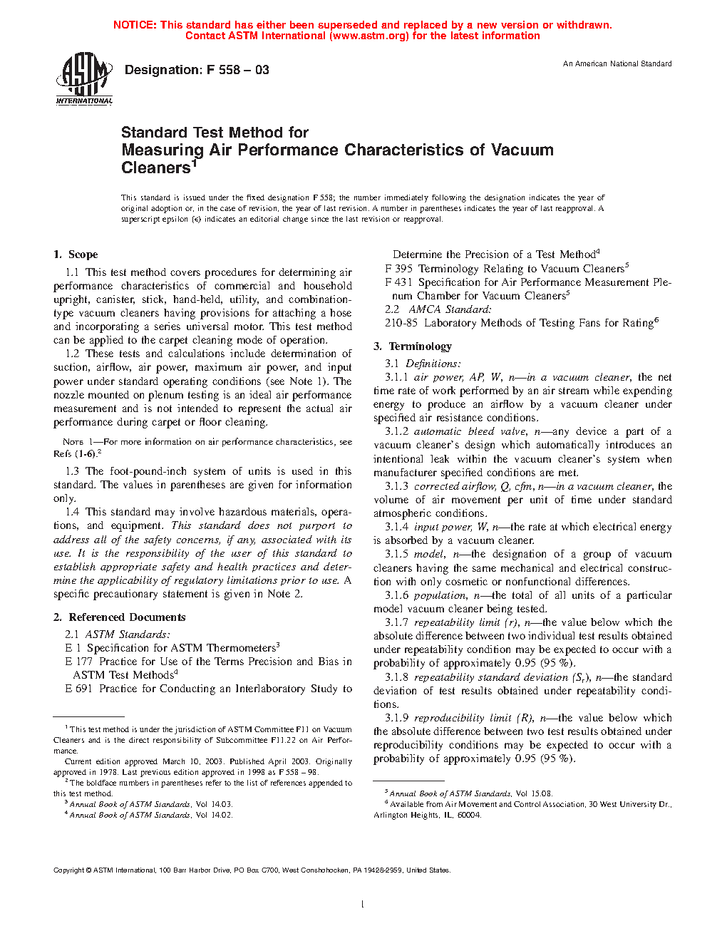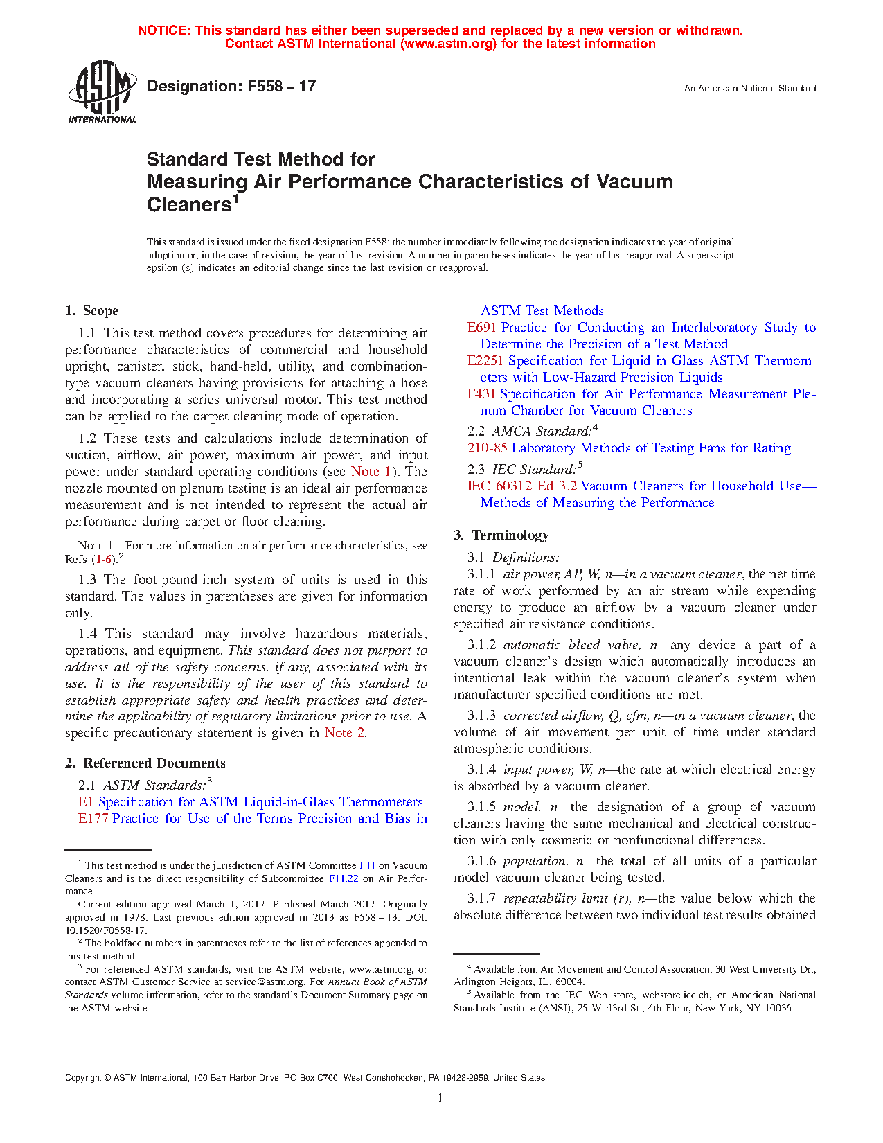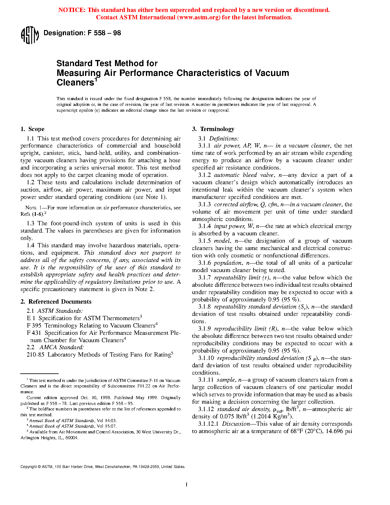 1.2 These tests and calculations include determination of suction, airflow, air power, maximum air power, and input power under standard operating conditions (see Note 1). The nozzle mounted on plenum testing is an ideal air performance measurement and is not intended to represent the actual air performance during carpet or floor cleaning.