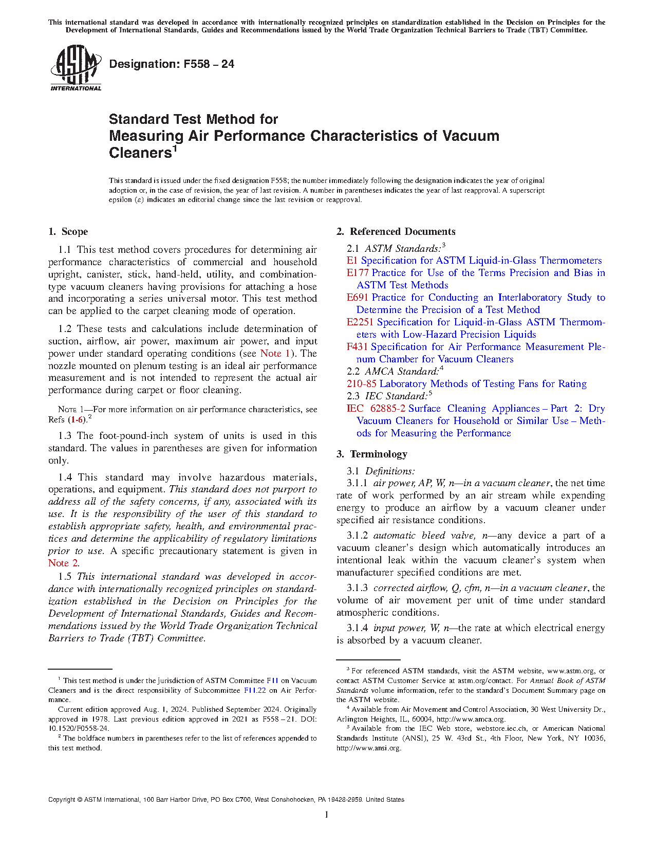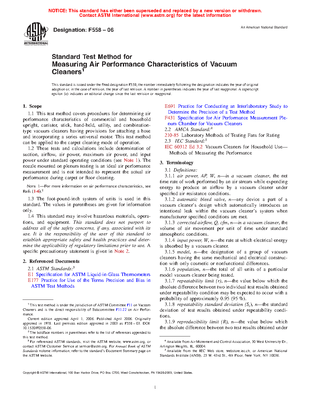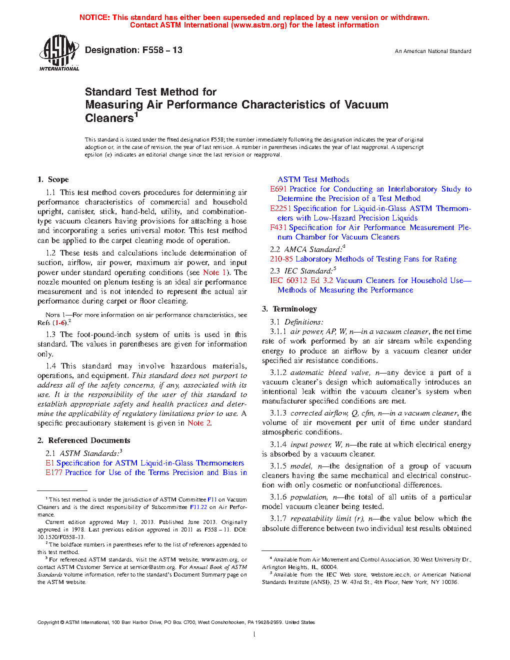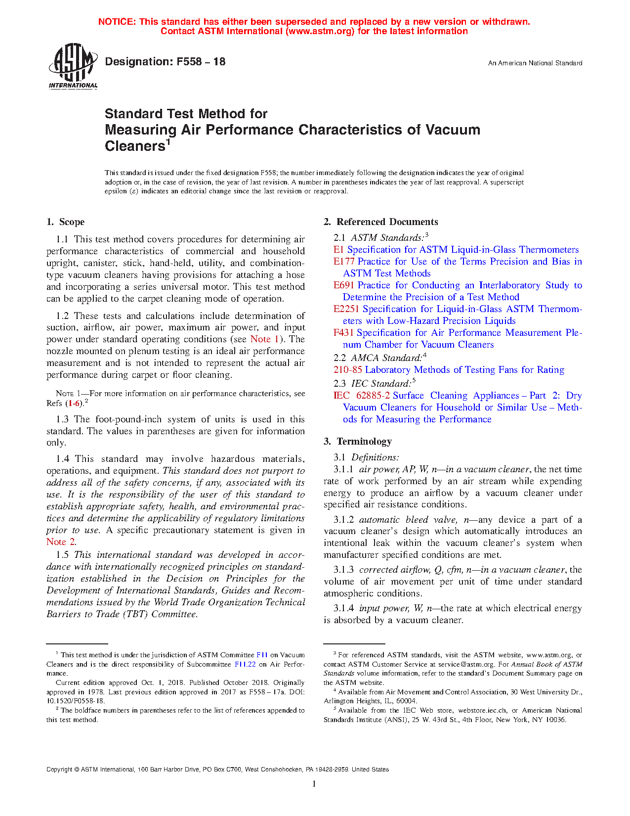 1.2 These tests and calculations include determination of suction, airflow, air power, maximum air power, and input power under standard operating conditions (see Note 1). The nozzle mounted on plenum testing is an ideal air performance measurement and is not intended to represent the actual air performance during carpet or floor cleaning.