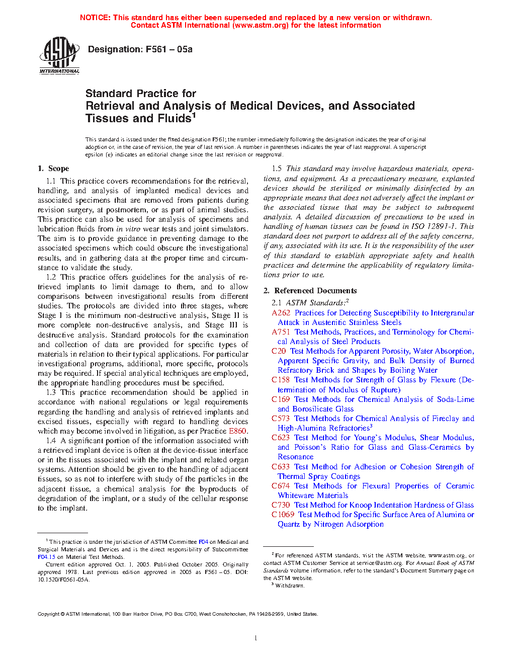 5.3 For the analysis to be accurate, it is essential that the device and associated tissues be removed minimizing as best as possible alteration of their form and structure. It is also essential that the tissues be handled in such a way as to avoid microbial or viral contamination of the work place or the investigator. The tissue-device interface may need to be stabilized with chemical fixation prior to separation of the device from it’s in-situ position. It is also highly recommended to document detailed information about the tissue specimens, including location of extraction. Standard protocols for the examination and collection of data are provided for retrieval and handling of implantable medical devices, as well as for specific types of materials in relation to their typical applications. For particular investigational programs, additional, more specific, protocols may be required. If special analytical techniques are employed, the appropriate procedures must be specified.