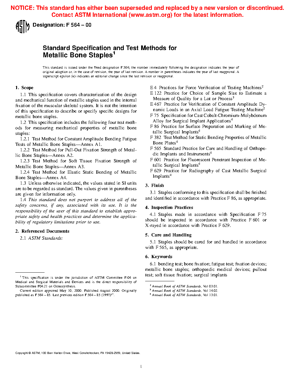 1.2 This specification includes the following four test methods for measuring mechanical properties of metallic bone staples: