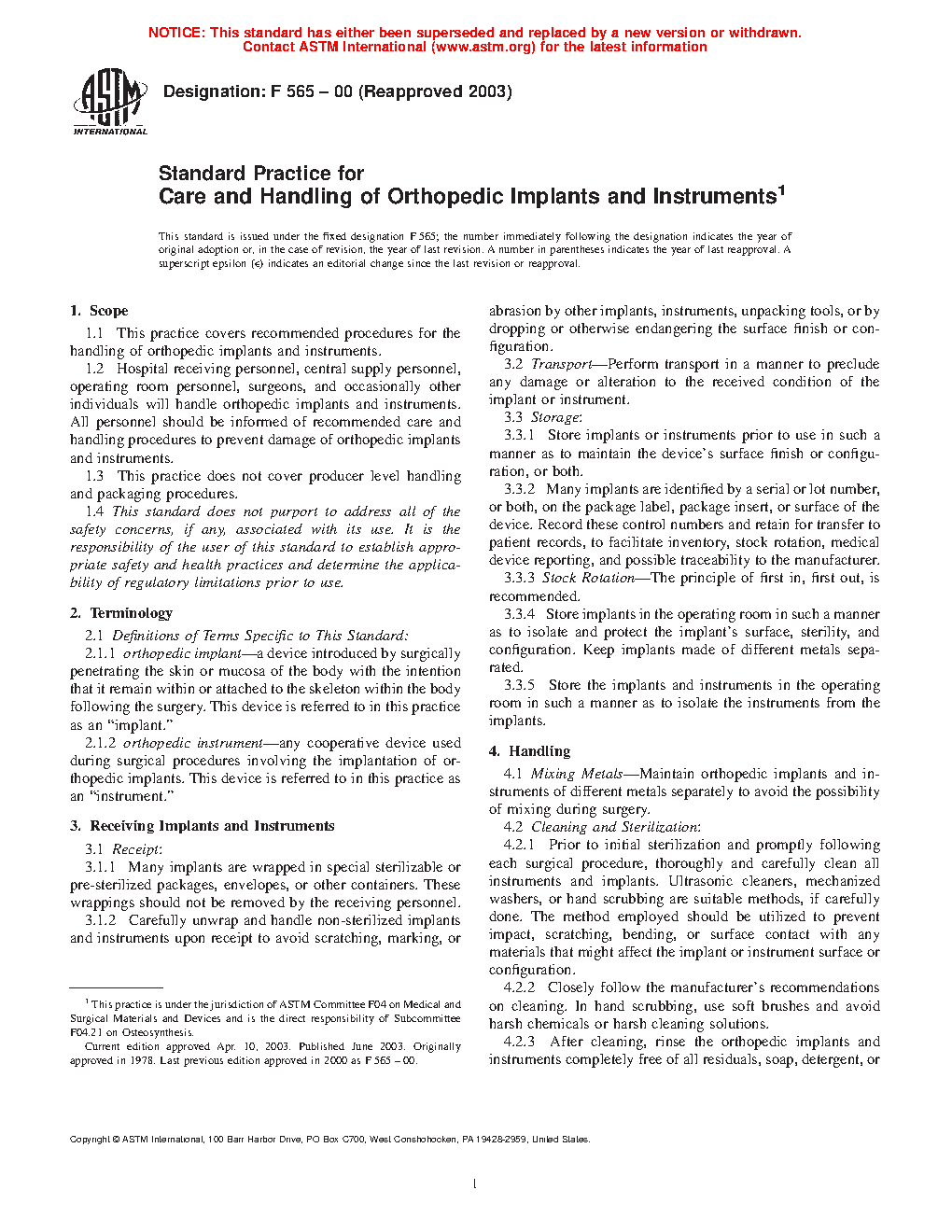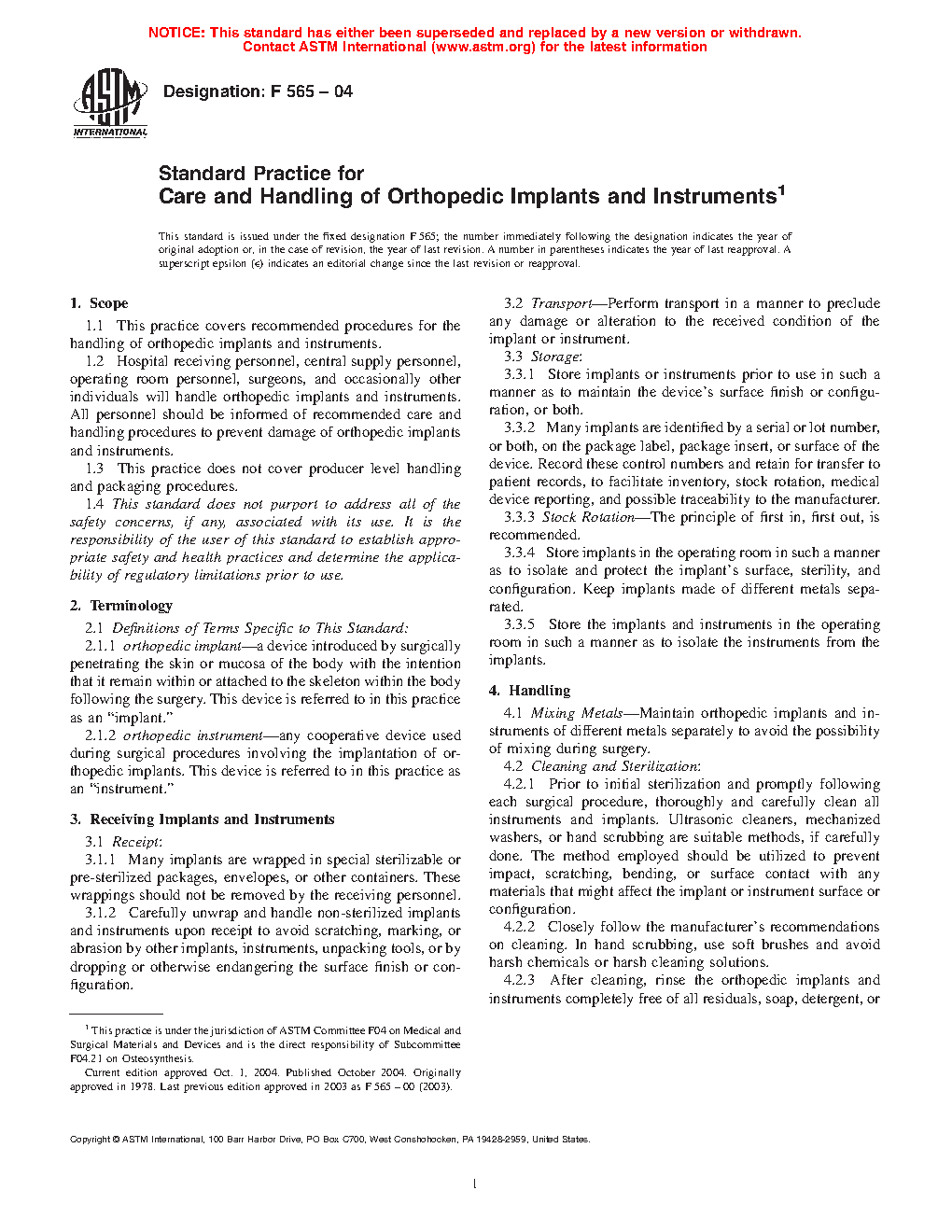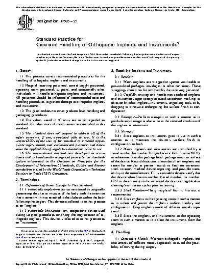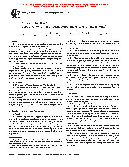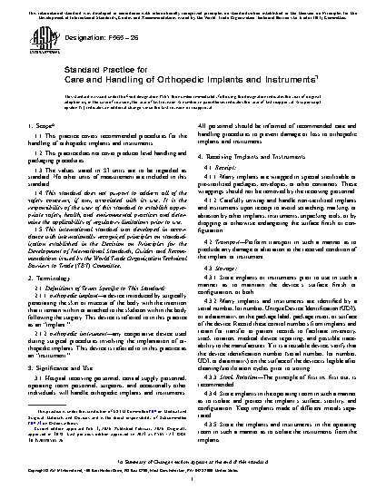 1.1 This practice covers recommended procedures for the handling of orthopedic implants and instruments.