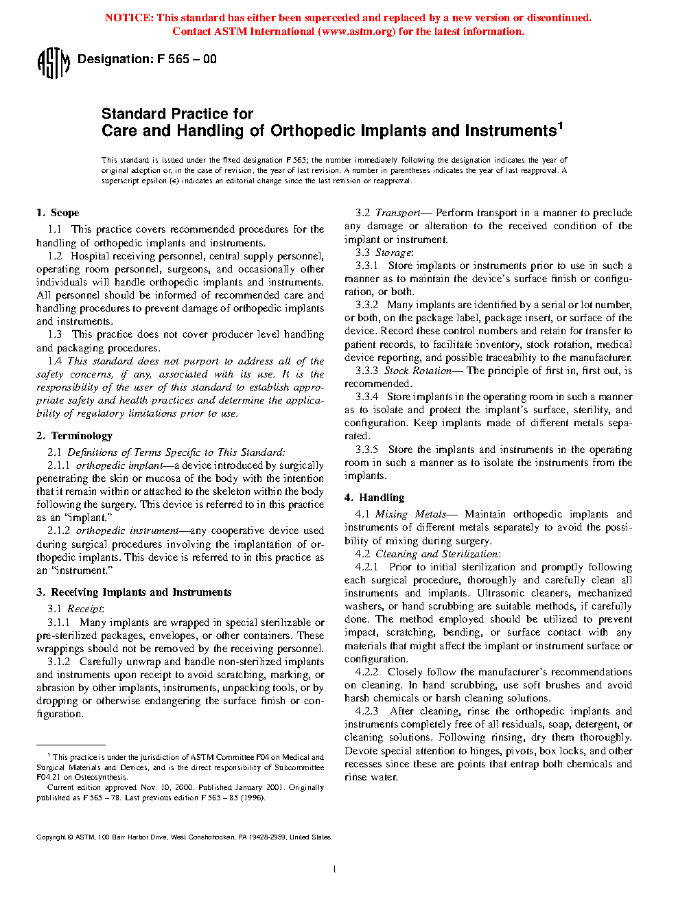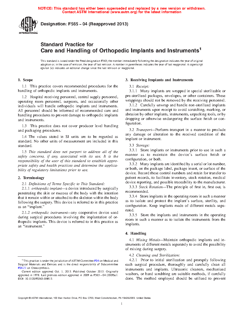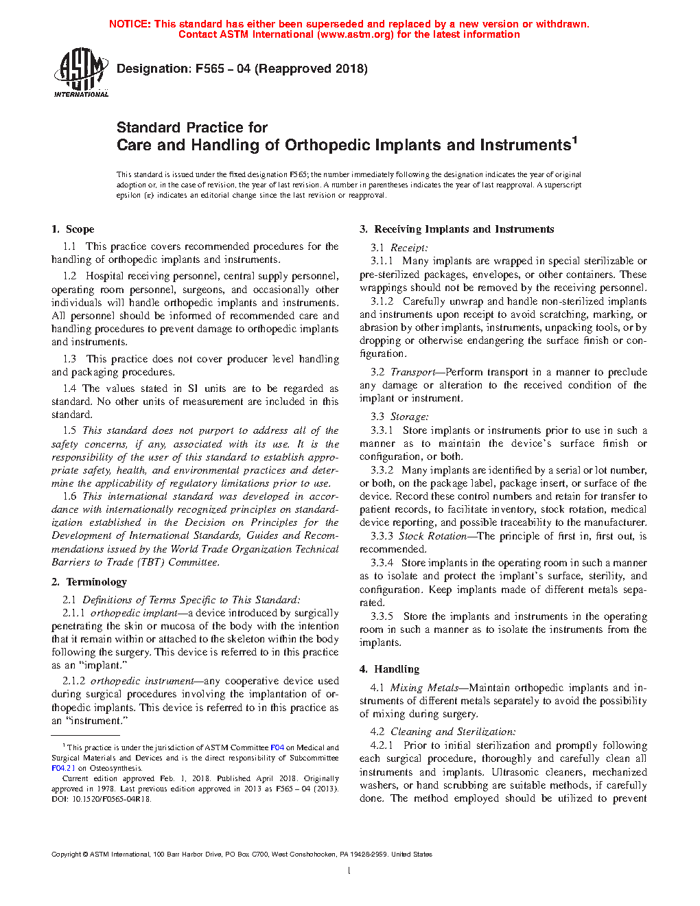 1.1 This practice covers recommended procedures for the handling of orthopedic implants and instruments.