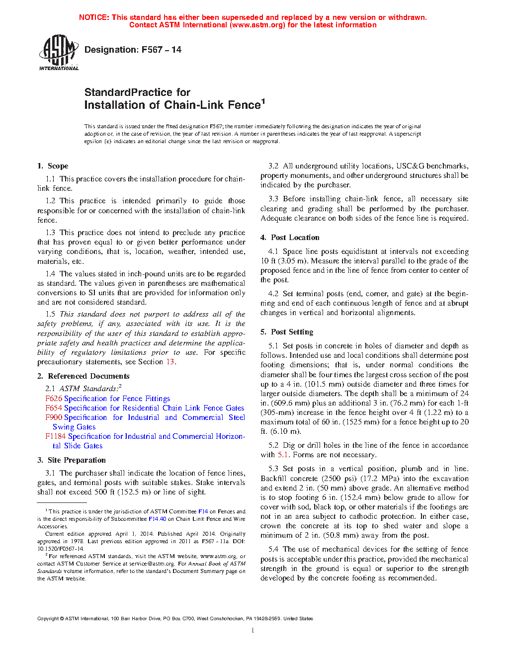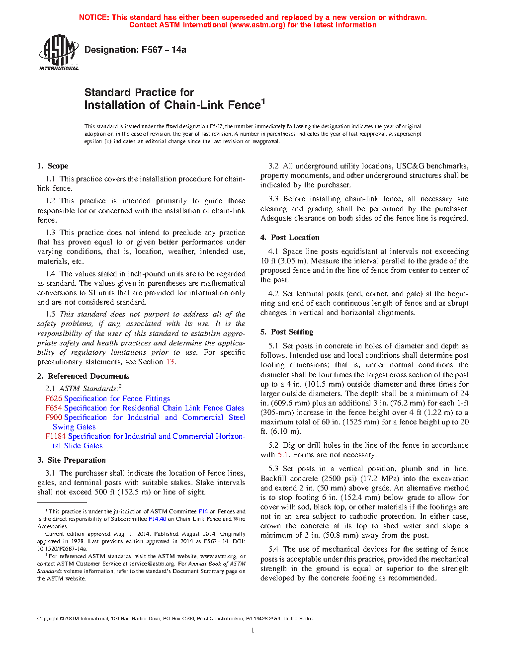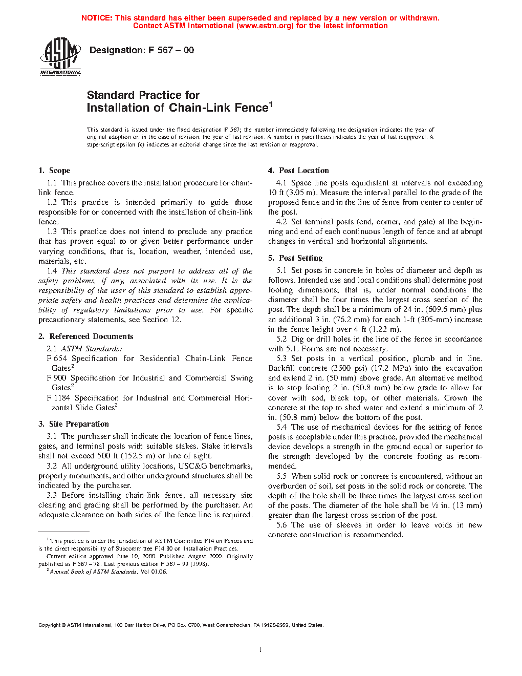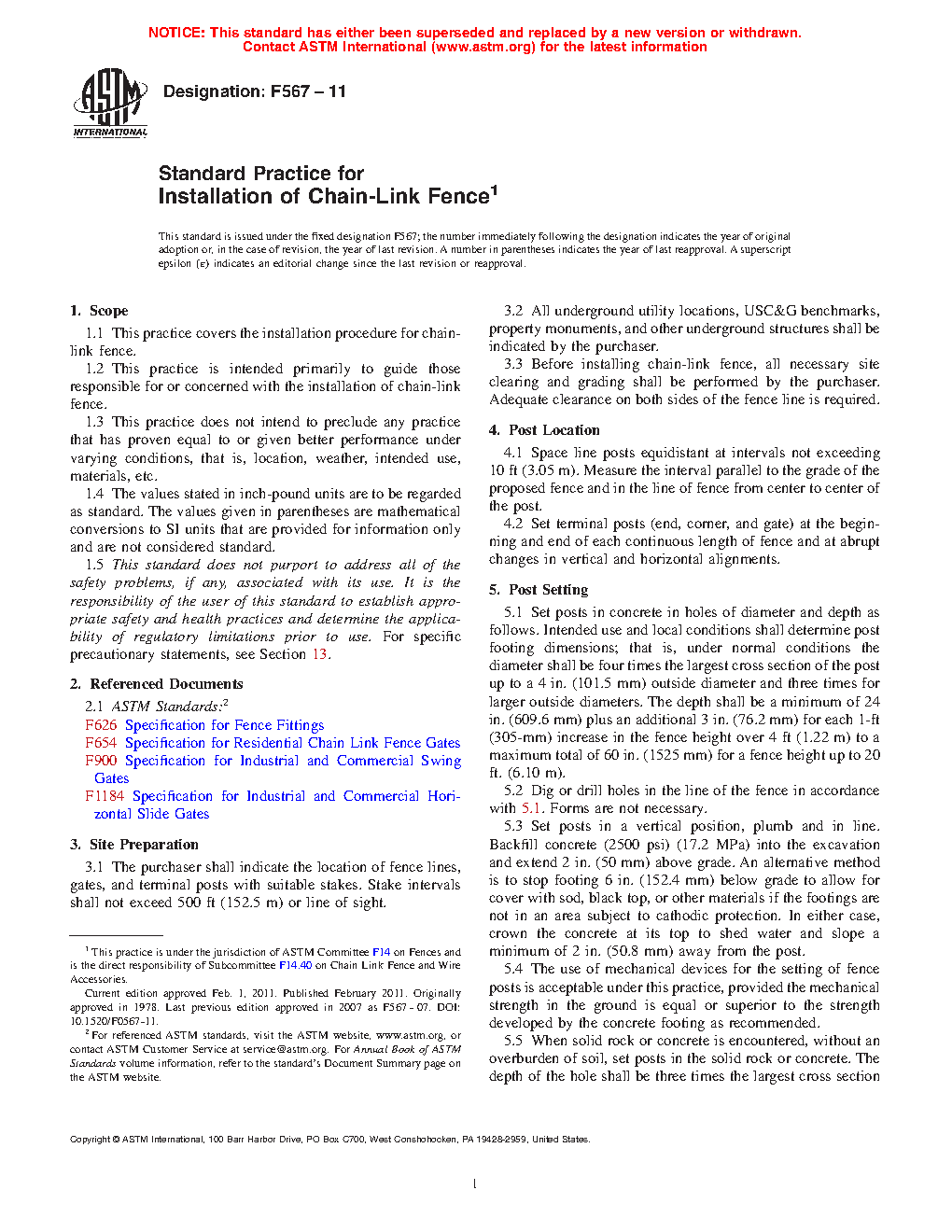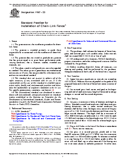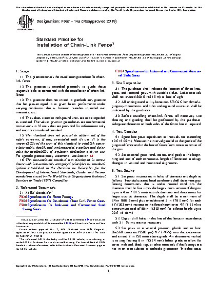 This practice establishes the standard installation procedures for chain-link fences. It includes site preparation, post location, post setting, and terminal post bracing measures. Also included here are the detailed requirements for the top rail and tension wire, tie wires and clips, chain-link fabric, barbed wires, and gates.