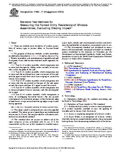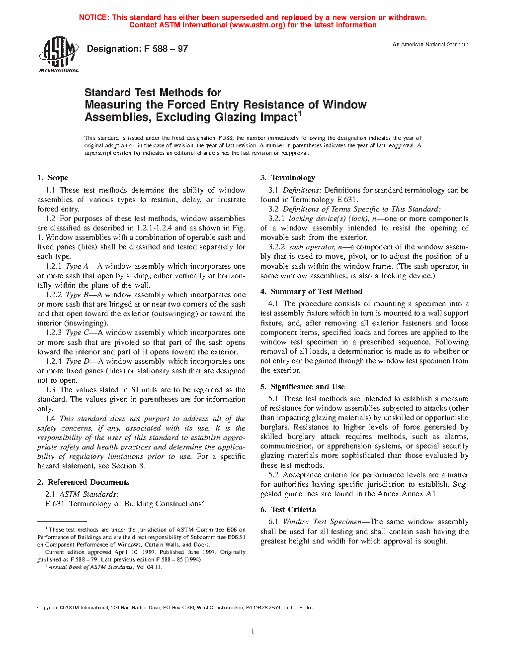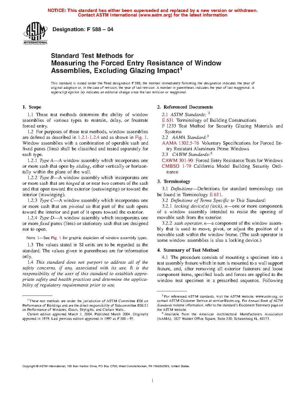 1.1 These test methods cover the ability of window assemblies of various types to restrain, delay, or frustrate forced entry.