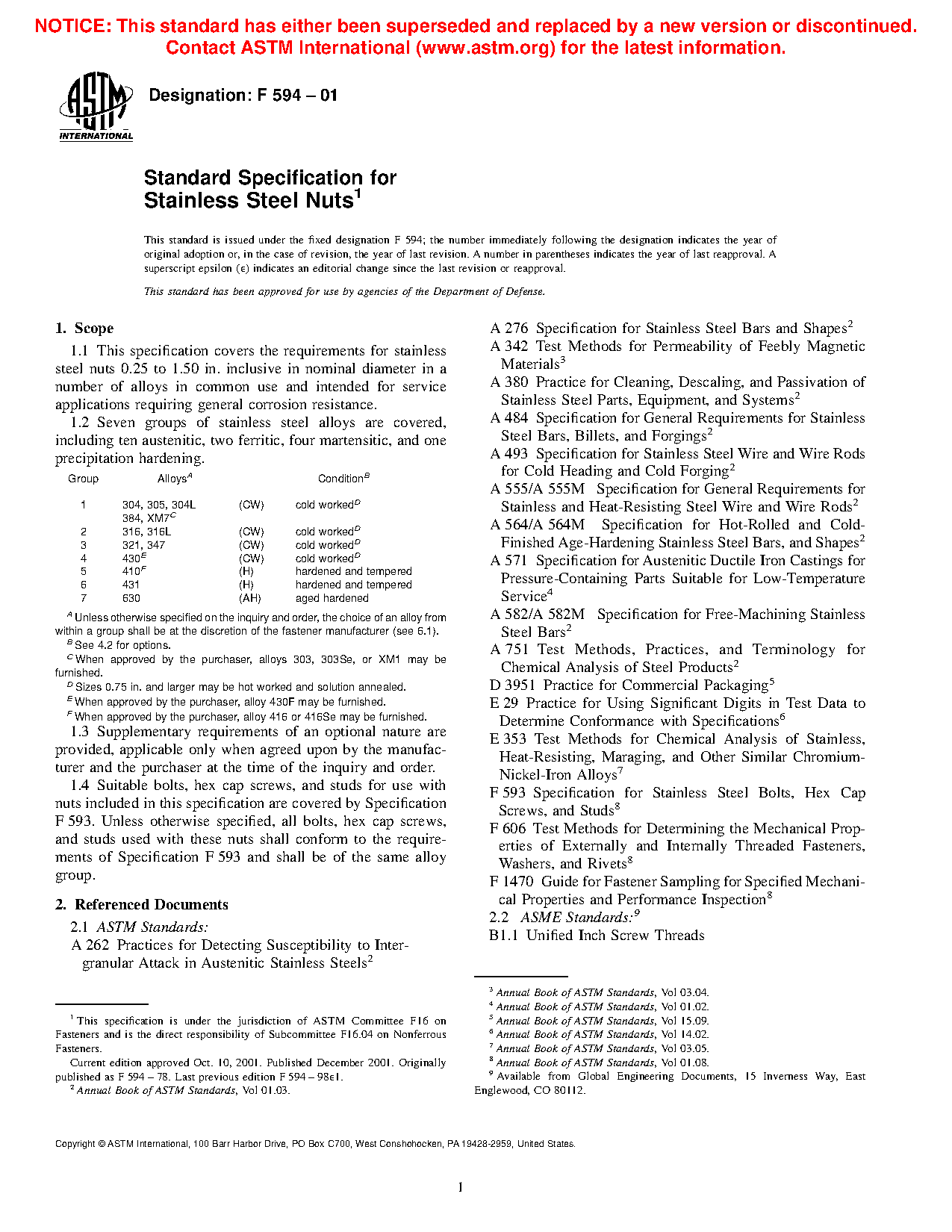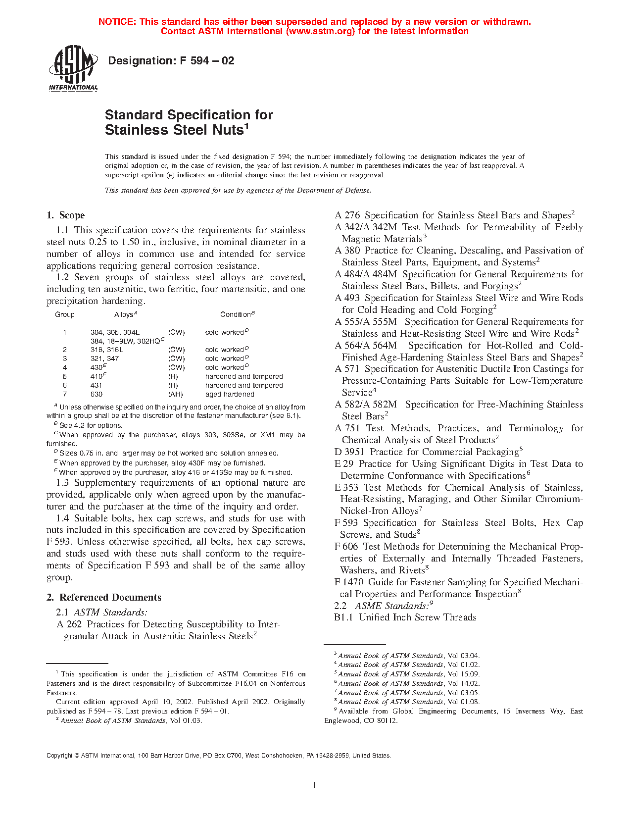 1.4 Suitable bolts, hex cap screws, and studs for use with nuts included in this specification are covered by Specification F593. Unless otherwise specified, all bolts, hex cap screws, and studs used with these nuts shall conform to the requirements of Specification F593 and shall be of the same alloy group.