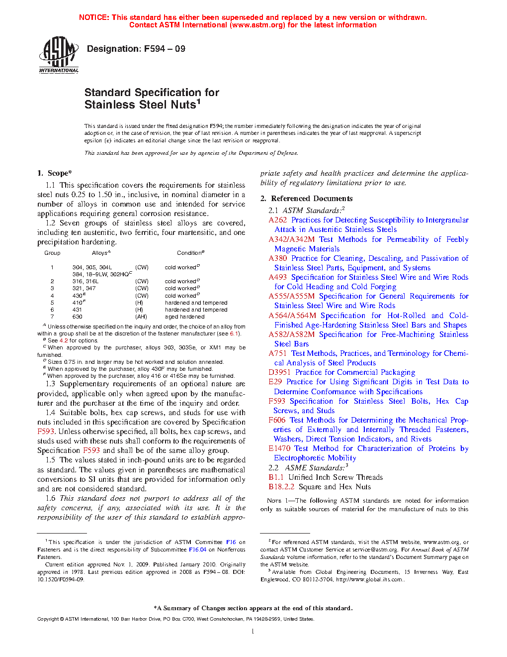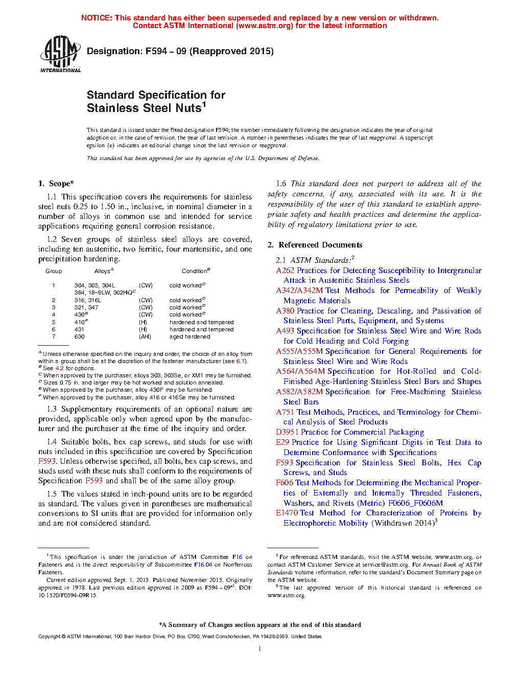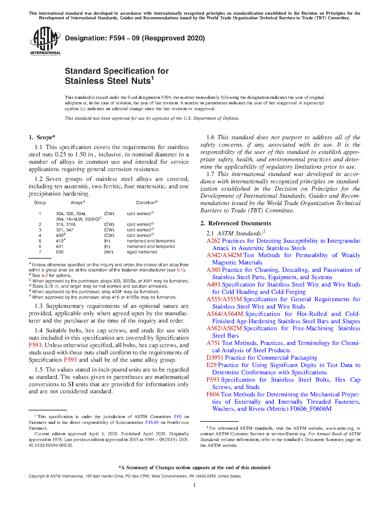 1.1 This specification covers the requirements for stainless steel nuts 0.25 to 1.50 in., inclusive, in nominal diameter in a number of alloys in common use and intended for service applications requiring general corrosion resistance.