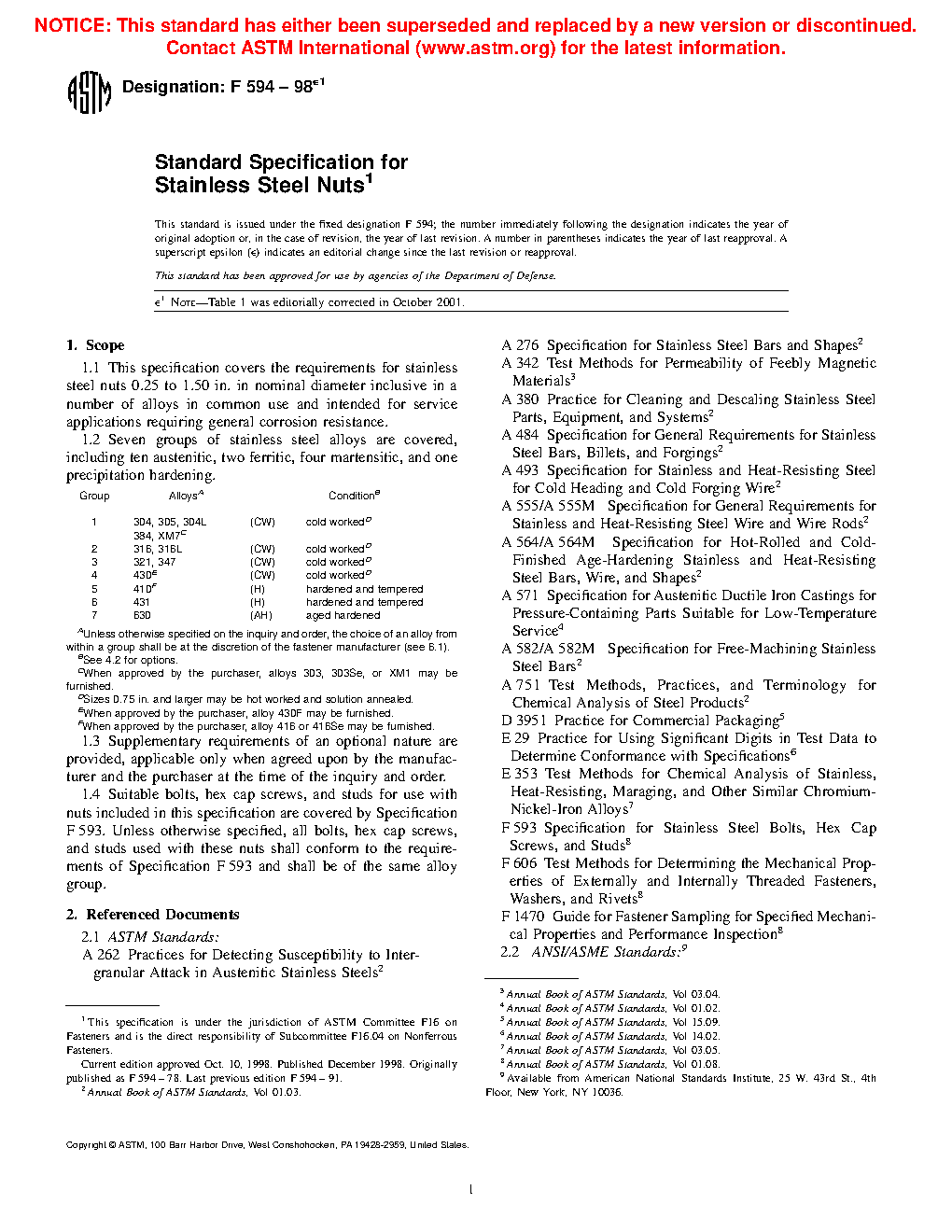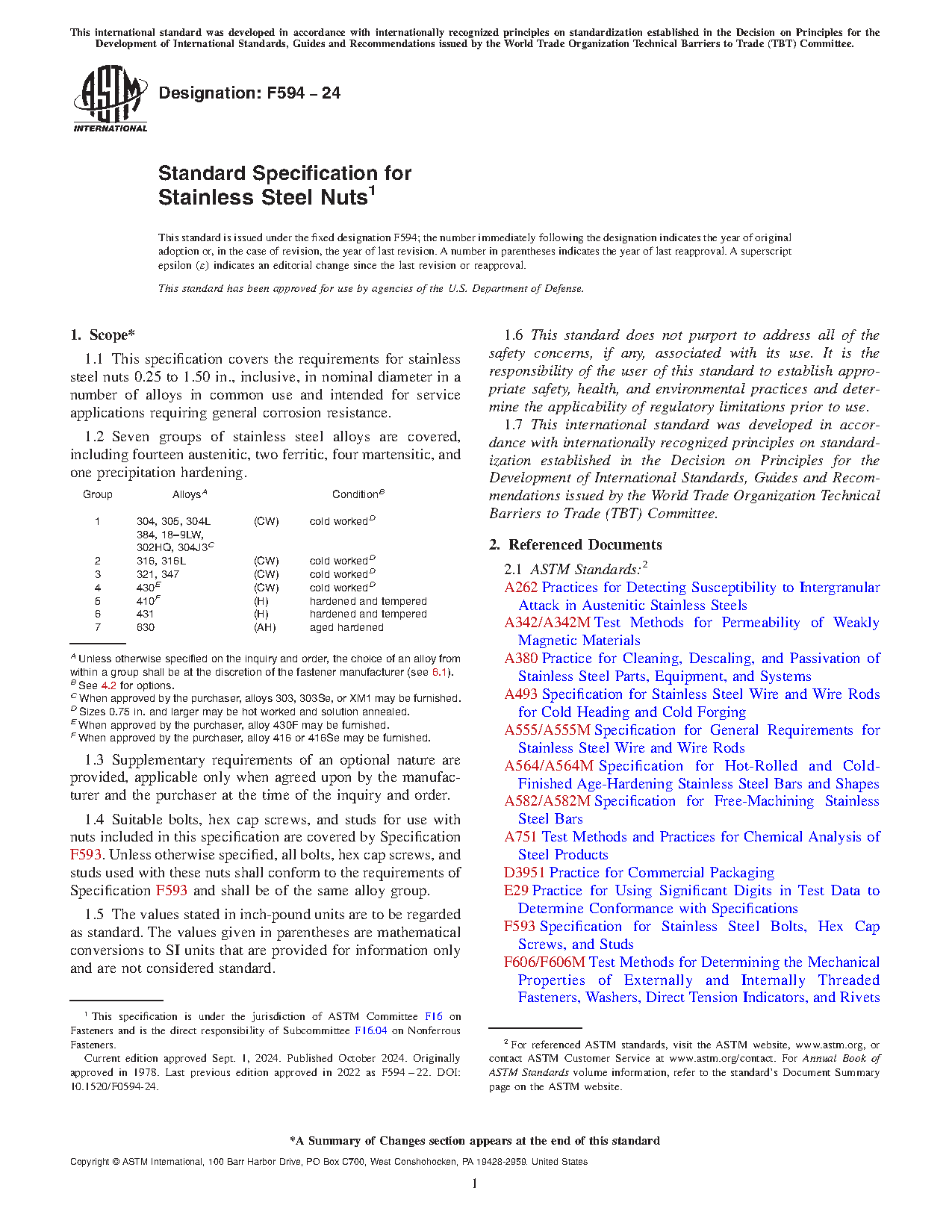 This specification covers the requirements for stainless steel nuts in specified size, inclusive, in nominal diameter in a number of alloys in common use and intended for service applications requiring general corrosion resistance. Seven groups of stainless steel alloys are covered, including ten austenitic, two ferritic, four martensitic, and one precipitation hardening: Group 1; Group 2; Group 3; Group 4; Group 5; Group 6; and Group 7. The finished fasteners shall meet the applicable mechanical properties. Chemical tests; mechanical tests; and corrosion resistance shall be performed to conform with the specified requirements.
