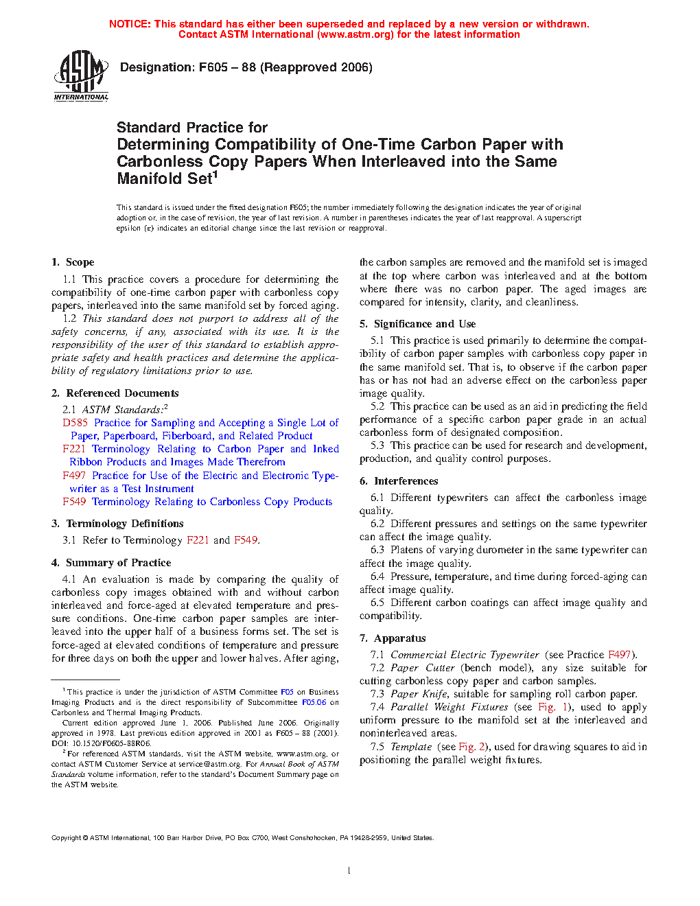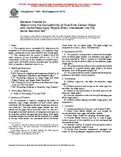 1.1 This practice covers a procedure for determining the compatibility of one-time carbon paper with carbonless copy papers, interleaved into the same manifold set by forced aging.