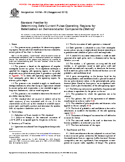 1.1 This practice covers procedures for determining operating regions that are safe from metallization burnout induced by current pulses of less than 1-s duration.