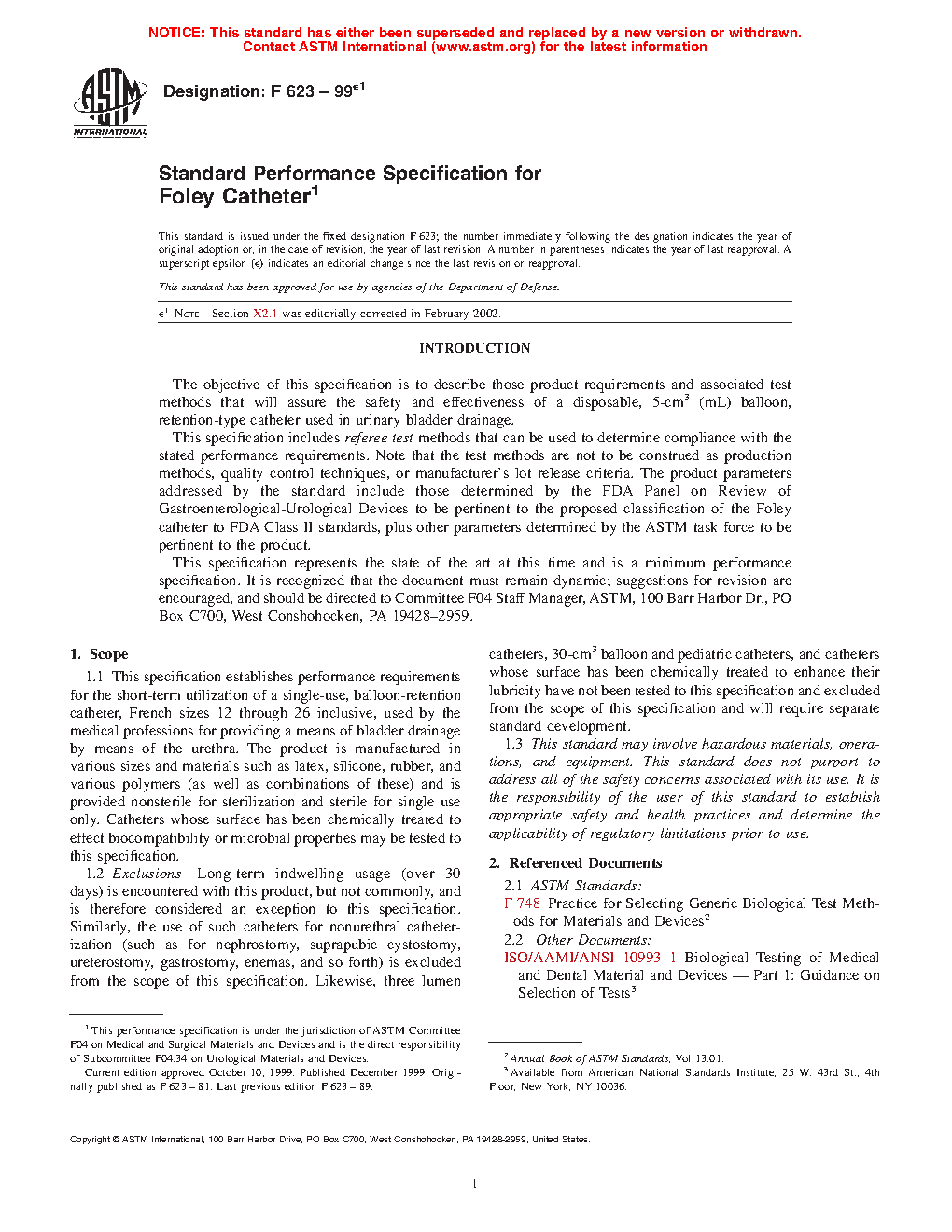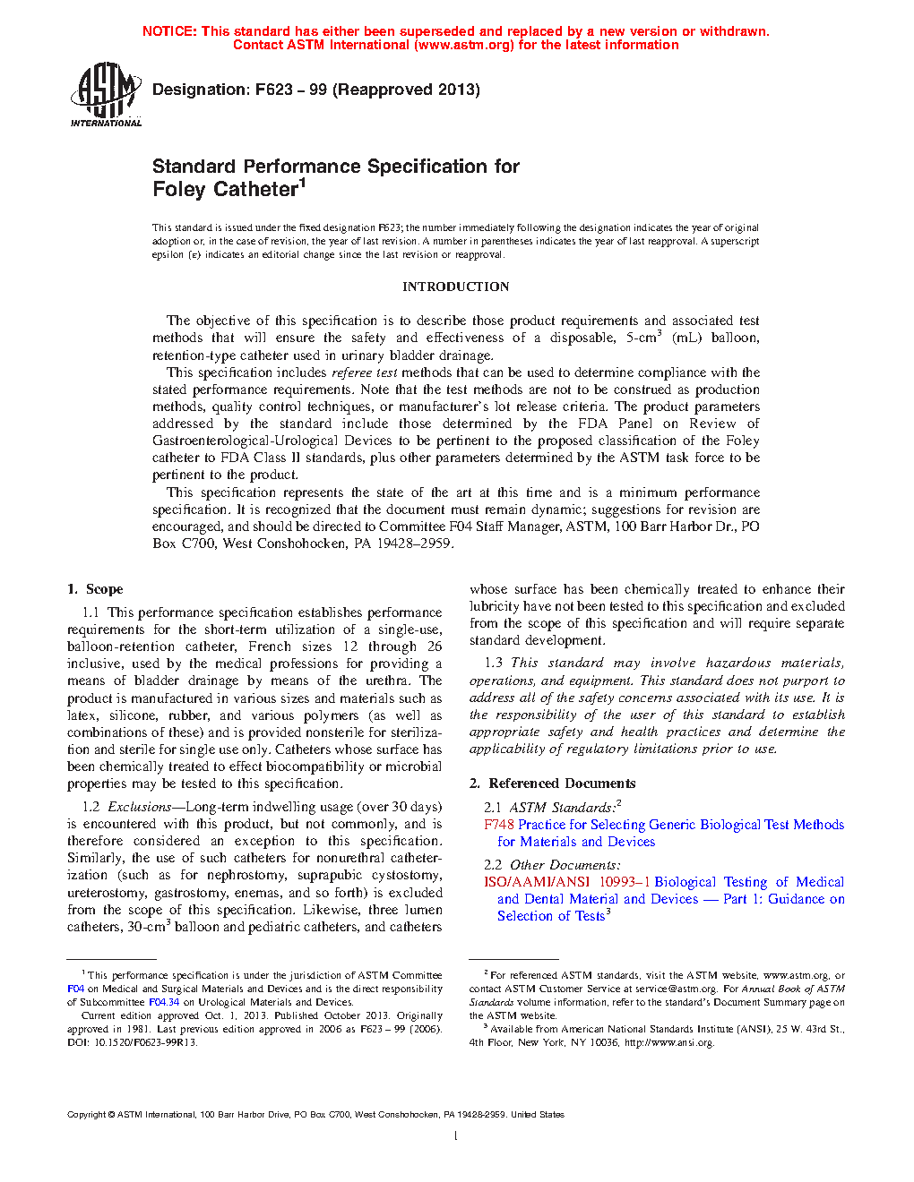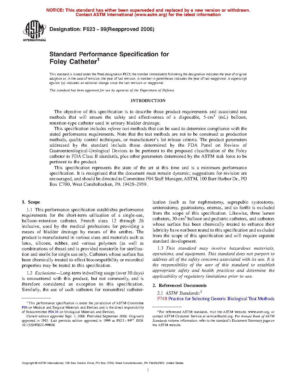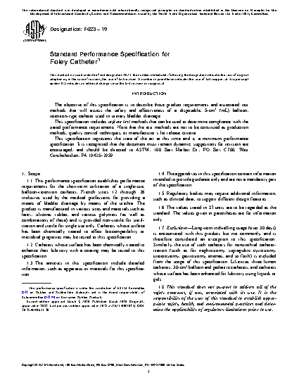 1.1 This performance specification establishes performance requirements for the short-term utilization of a single-use, balloon-retention catheter, French sizes 12 through 26 inclusive, used by the medical professions for providing a means of bladder drainage by means of the urethra. The product is manufactured in various sizes and materials such as latex, silicone, rubber, and various polymers (as well as combinations of these) and is provided non-sterile for sterilization and sterile for single use only. Catheters whose surface has been chemically treated to effect biocompatibility or microbial properties may be tested to this specification.