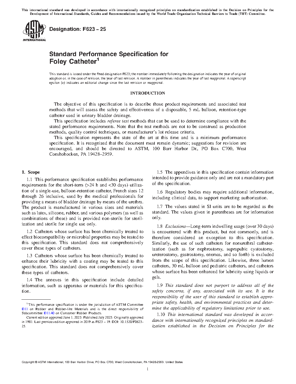 1.7 Exclusions—Long-term indwelling usage (over 30 days) is encountered with this product, but not commonly, and is therefore considered an exception to this specification. Similarly, the use of such catheters for nonurethral catheterization (such as for nephrostomy, suprapubic cystostomy, ureterostomy, gastrostomy, enemas, and so forth) is excluded from the scope of this specification. Likewise, three lumen catheters, 30-cm3 balloon and pediatric catheters, and catheters whose surface has been enhanced for lubricity using liquids or gels.