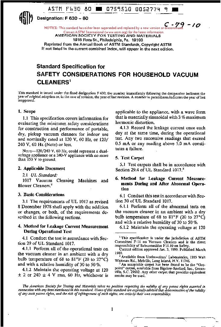 Specification for Safety Consideration for Household Vacuum Cleaners (Withdrawn 1988)