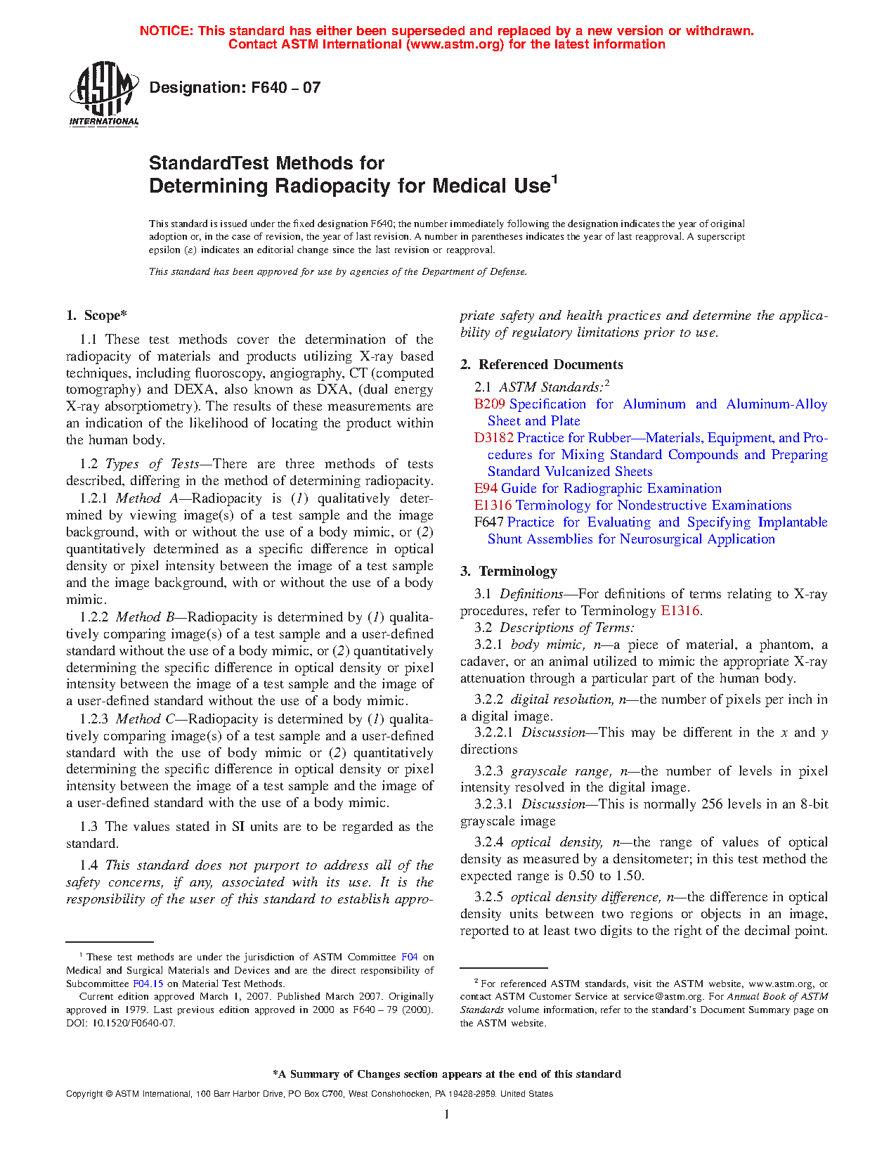 1.2 Radiopacity is determined by (a) qualitatively comparing image(s) of a test specimen and a user-defined standard, with or without the use of a body mimic; or (b) quantitatively determining the specific difference in optical density or pixel intensity between the image of a test specimen and the image of a user-defined standard, with or without the use of a body mimic.