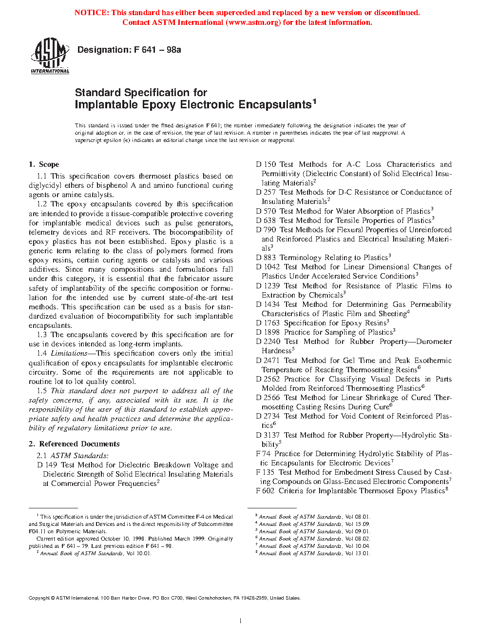 1.2 The epoxy encapsulants covered by this specification are intended to provide a tissue-compatible protective covering for implantable medical devices such as pulse generators, telemetry devices and RF receivers. The biocompatibility of epoxy plastics has not been established. Epoxy plastic is a generic term relating to the class of polymers formed from epoxy resins, certain curing agents or catalysts and various additives. Since many compositions and formulations fall under this category, it is essential that the fabricator assure safety of implantability of the specific composition or formulation for the intended use by current state-of-the-art test methods. This specification can be used as a basis for standardized evaluation of biocompatibility for such implantable encapsulants.
