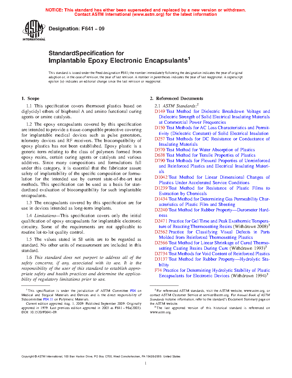 1.4 Limitations—This specification covers only the initial qualification of epoxy encapsulants for implantable electronic circuitry. Some of the requirements are not applicable to routine lot-to-lot quality control.