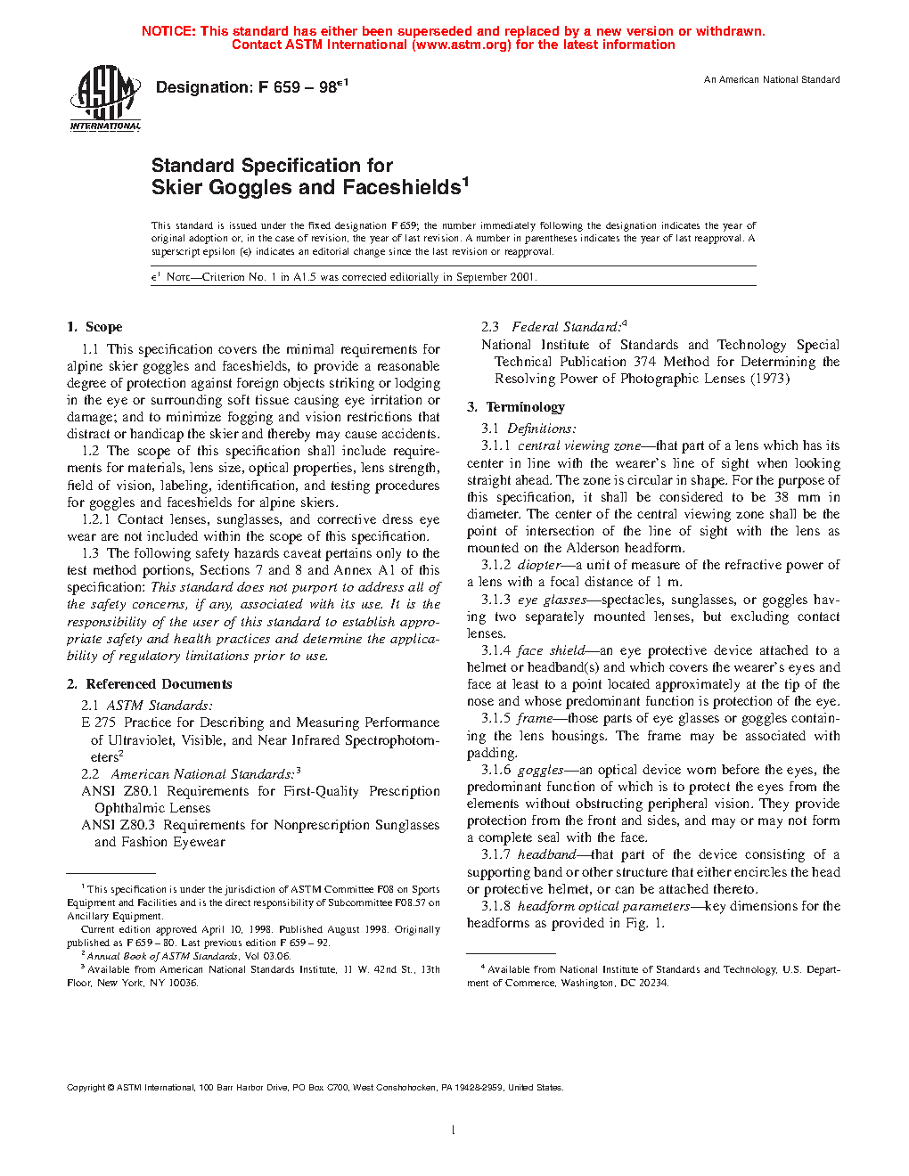 This specification covers the material, design, optical, and strength requirements, and associated test procedures for goggles and faceshields used by alpine skiers, to provide a reasonable degree of protection against foreign objects that strike or lodge the eye or surrounding soft tissue causing eye irritation or damage, as well as to minimize fogging and vision restrictions that distract or handicap the skier, thereby causing accidents. Contact lenses, sunglasses, and corrective dress eye wear are not included within the scope of this specification. When tested by the methods provided herein, these eye protective devices shall adhere to specified optical requirements in terms of field of view (temporal, nasal, superior, and inferior fields), luminous transmittance, refractive tolerances, astigmatism, refractive power imbalance, prismatic deviation and imbalance (vertical and horizontal imbalances), optical defects, and physical lens defects. The protective eyewear shall also meet light-transmitting ability requirements such as clearness, ultraviolet and infrared filtration, and resistance to fogging. Furthermore, lens strength shall be examined as well by means of basic impact resistance and higher impact resistance tests.