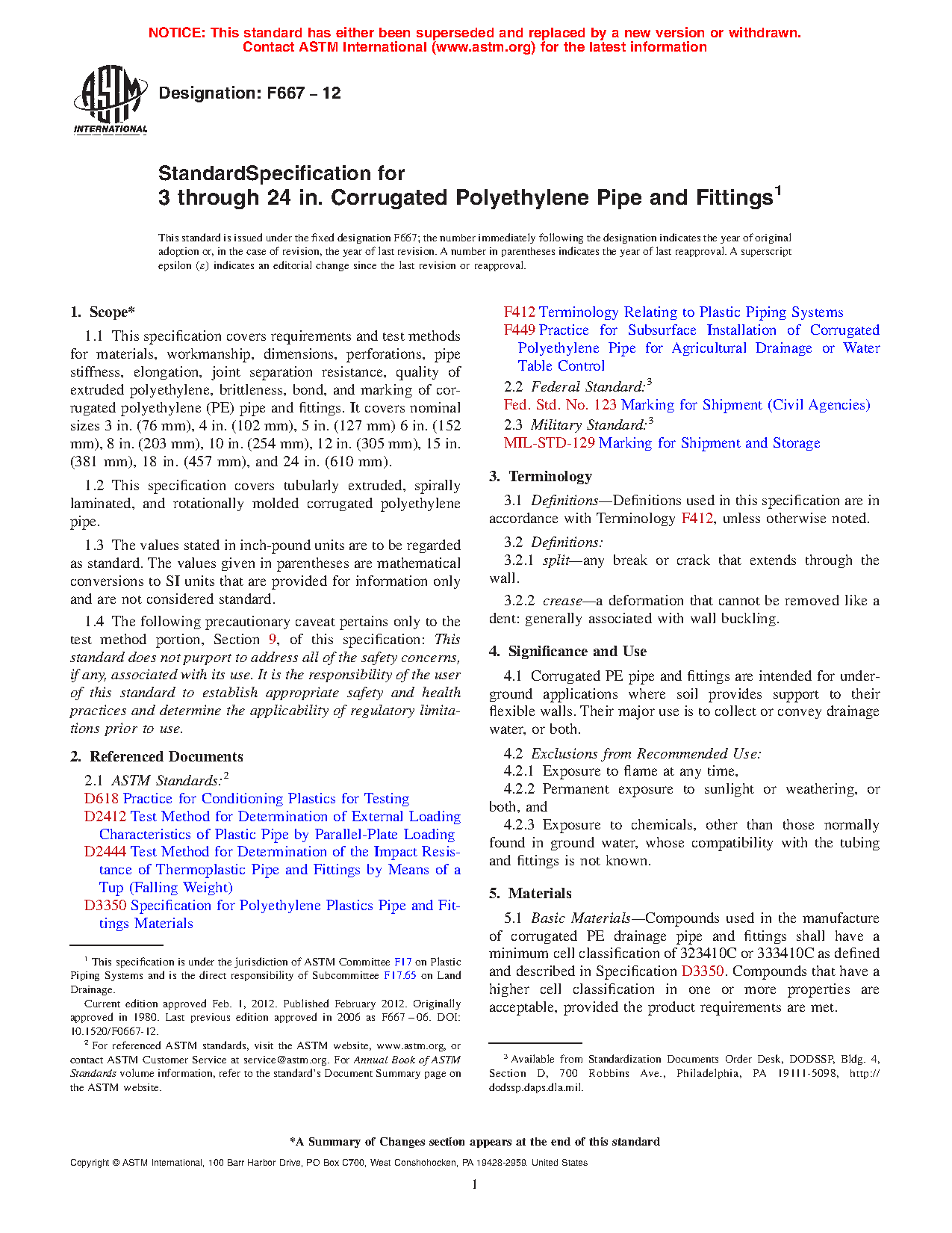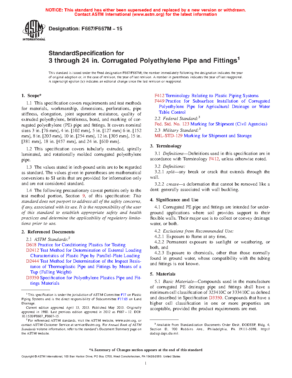 1.1 This specification covers requirements and test methods for materials, workmanship, dimensions, perforations, pipe stiffness, elongation, joint separation resistance, quality of extruded polyethylene, brittleness, bond, and marking of corrugated polyethylene (PE) pipe and fittings. It covers nominal sizes 3 in. [76 mm], 4 in. [102 mm], 5 in. [127 mm] 6 in. [152 mm], 8 in. [203 mm], 10 in. [254 mm], 12 in. [305 mm], 15 in. [381 mm], 18 in. [457 mm], and 24 in. [610 mm].