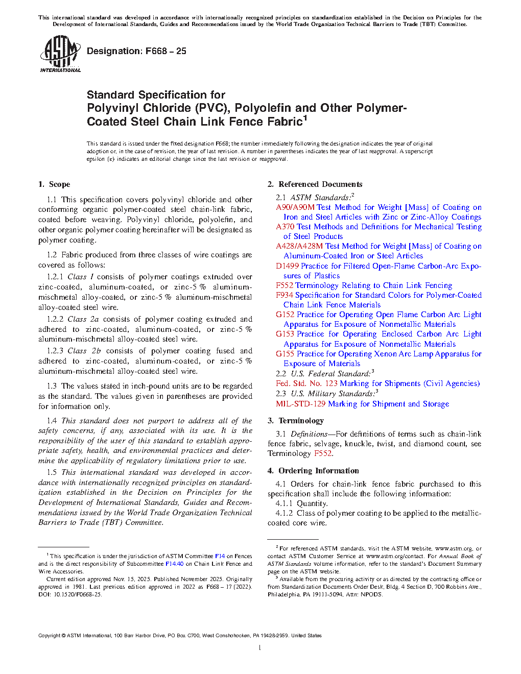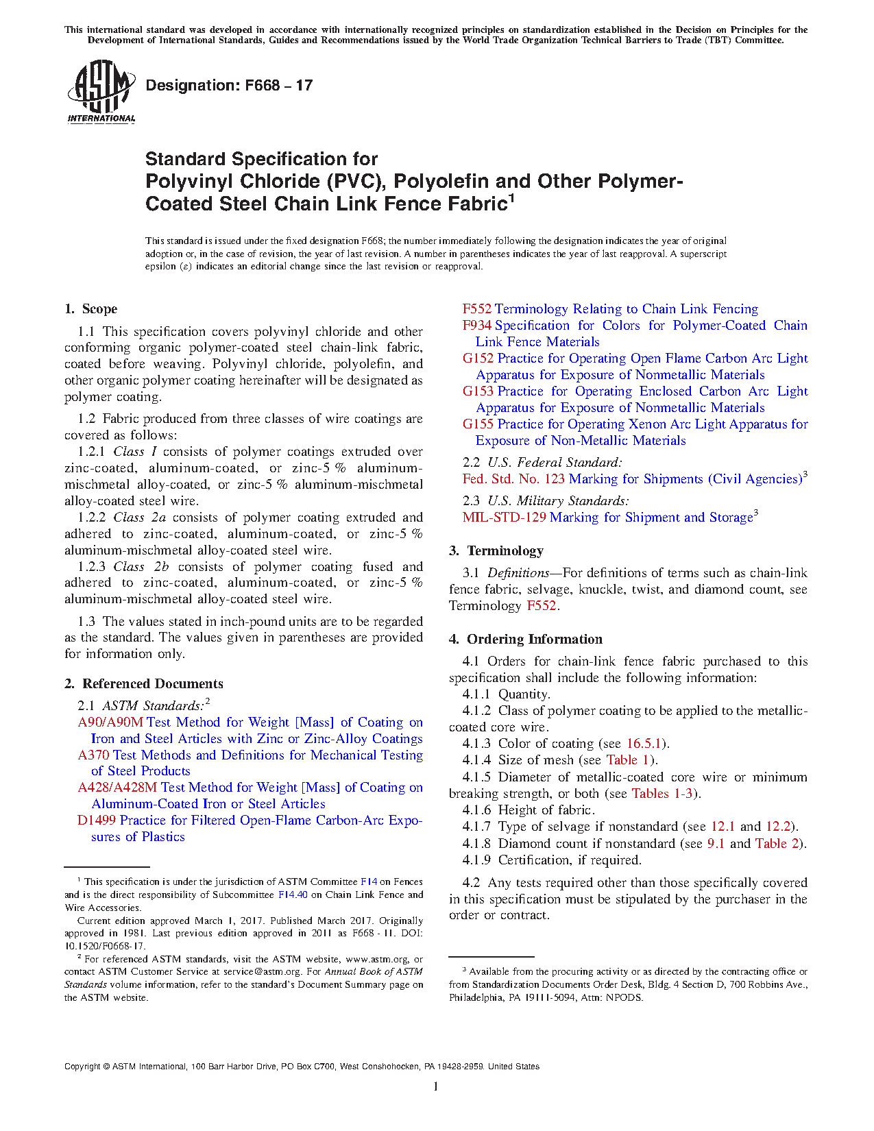 This specification covers polyvinyl chloride and other conforming organic polymer-coated steel chain-link fabric, coated before weaving. Fabric produced from three classes of wire coatings are covered as follows: Class I consists of polymer coatings extruded over zinc-coated, aluminum-coated, or zinc-5 % aluminum-mischmetal alloy-coated, or zinc-5 % aluminum-mischmetal alloy-coated steel wire; Class 2a consists of polymer coating extruded and adhered to zinc-coated, aluminum-coated, or zinc-5 % aluminum-mischmetal alloy-coated steel wire; Class 2b consists of polymer coating fused and adhered to zinc-coated, aluminum-coated, or zinc-5 % aluminum-mischmetal alloy-coated steel wire. Materials shall be tested and the individual grades shall conform to material, weave, mesh size, diamond count, wire size, fabric height, selvage, breaking strength, weight of Zinc, Aluminum, or Zinc-5 % Aluminum-Mischmetal Alloy Coatings, polymer coating thickness, polymer-coated wire, and roll length.