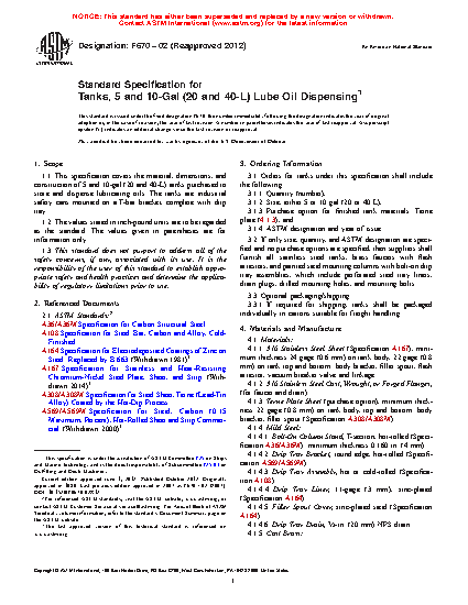 1.1 This specification covers the material, dimensions, and construction of 5 and 10-gal (20 and 40-L) tanks purchased to store and dispense lubricating oils. The tanks are industrial safety cans mounted on a T-bar bracket, complete with drip tray.