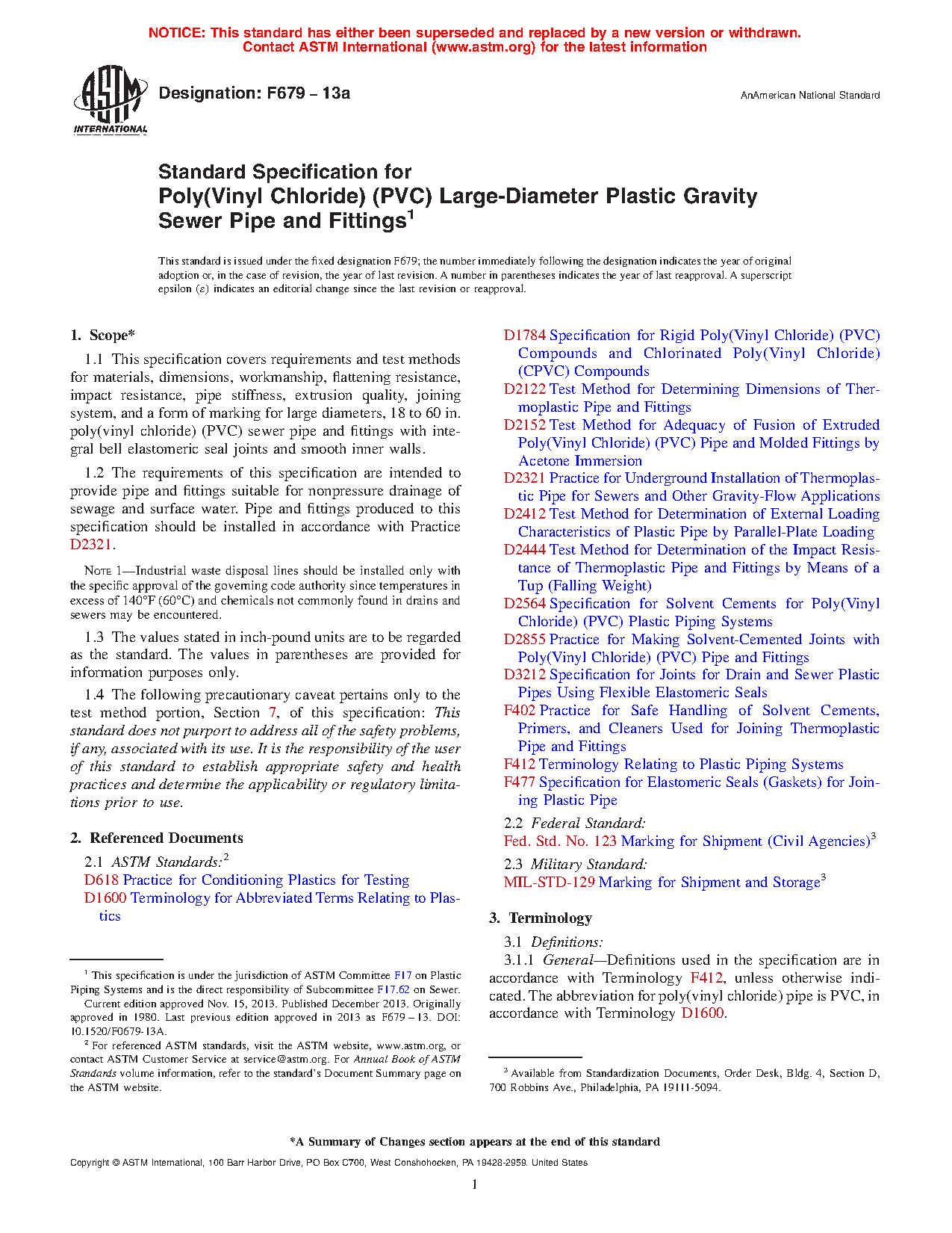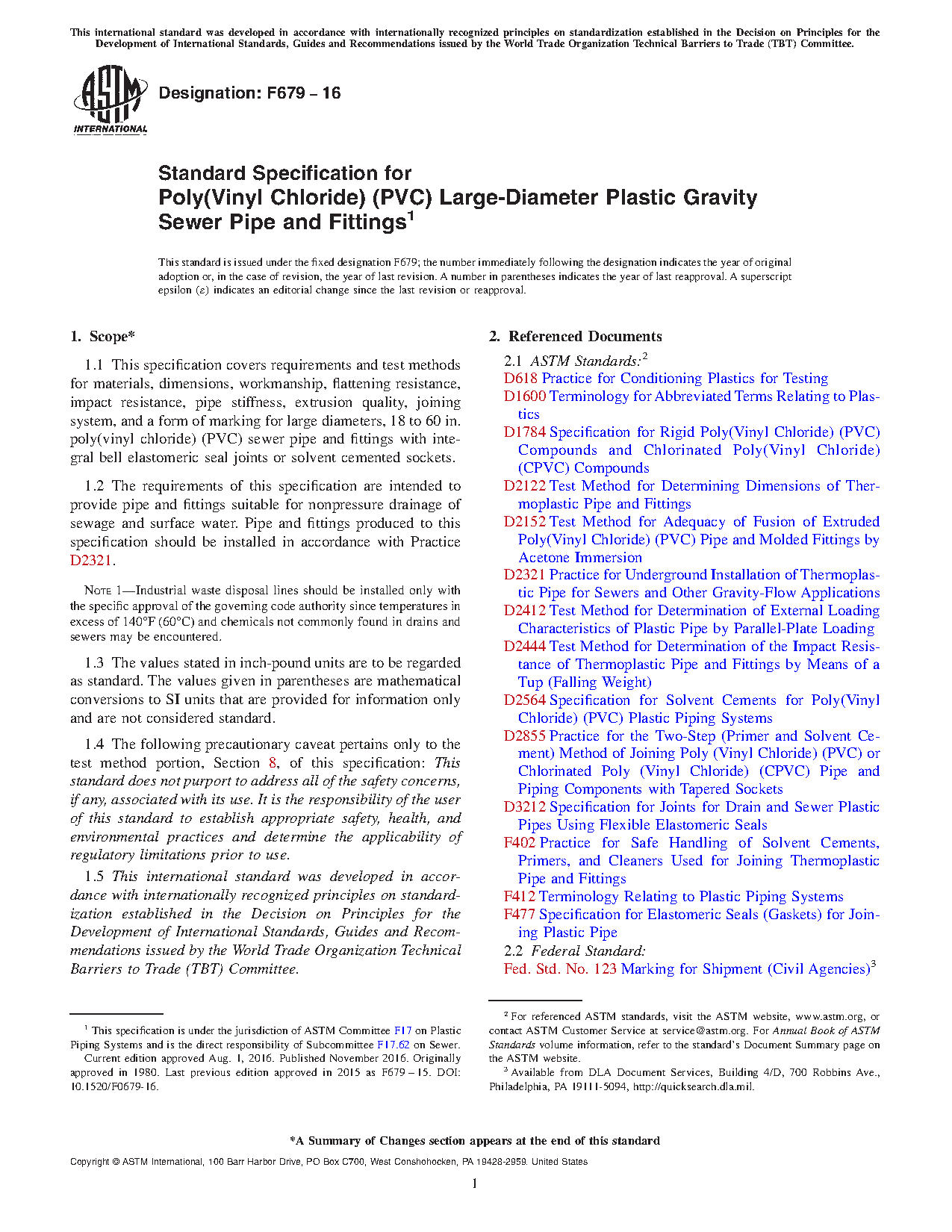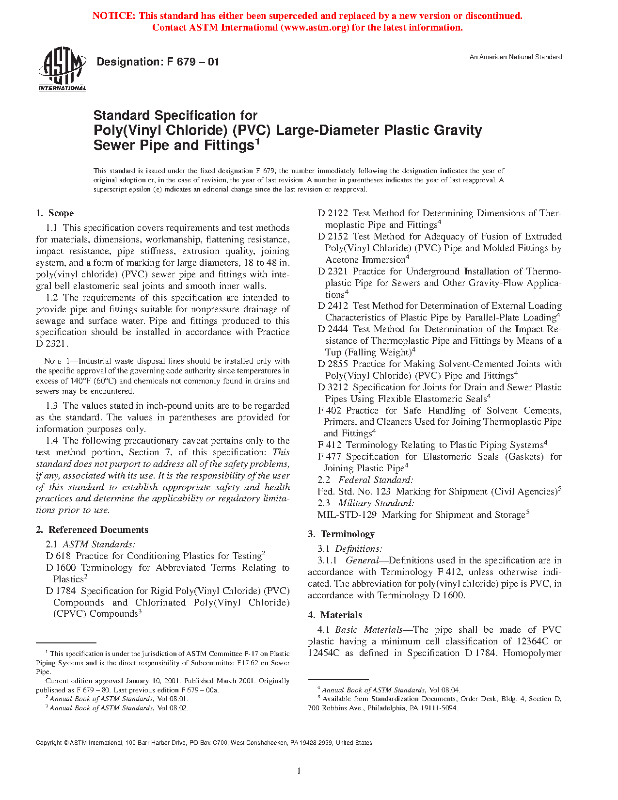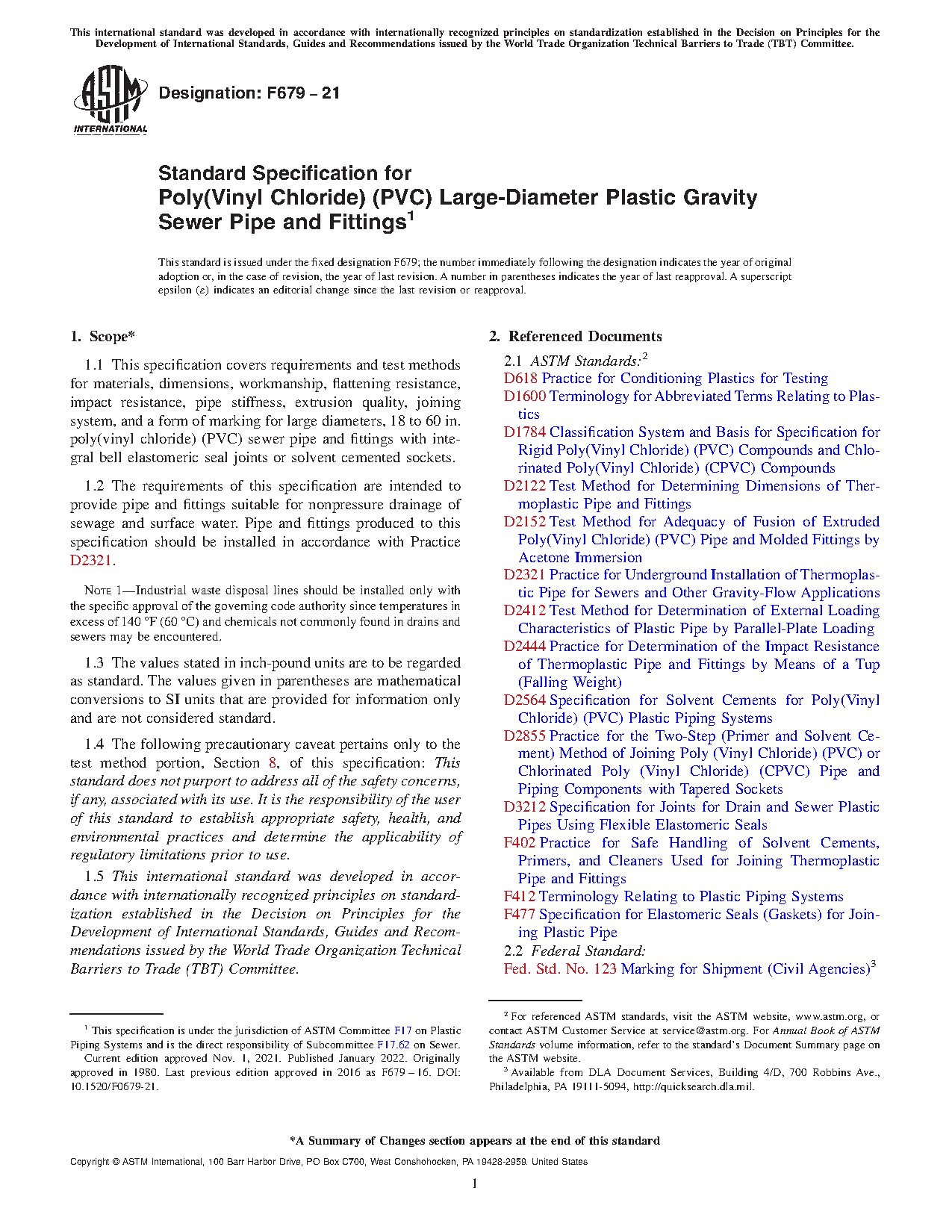 This specification covers requirements and test methods for poly(vinyl chloride) (PVC) large-diameter plastic gravity sewer pipe and fittings. Pipe requirements include workmanship, pipe dimensions, flattening resistance, impact resistance, pipe stiffness, gaskets requirements, joint tightness, extrusion quality, joining system, and markings. Test procedures shall include referee testing, quality control tests, test conditions, flattening tests, impact resistance, pipe stiffness, and acetone immersion test. Retest, rejection, inspection, certification, marking, delivery, and quality assurance shall conform to the requirements of this specification.