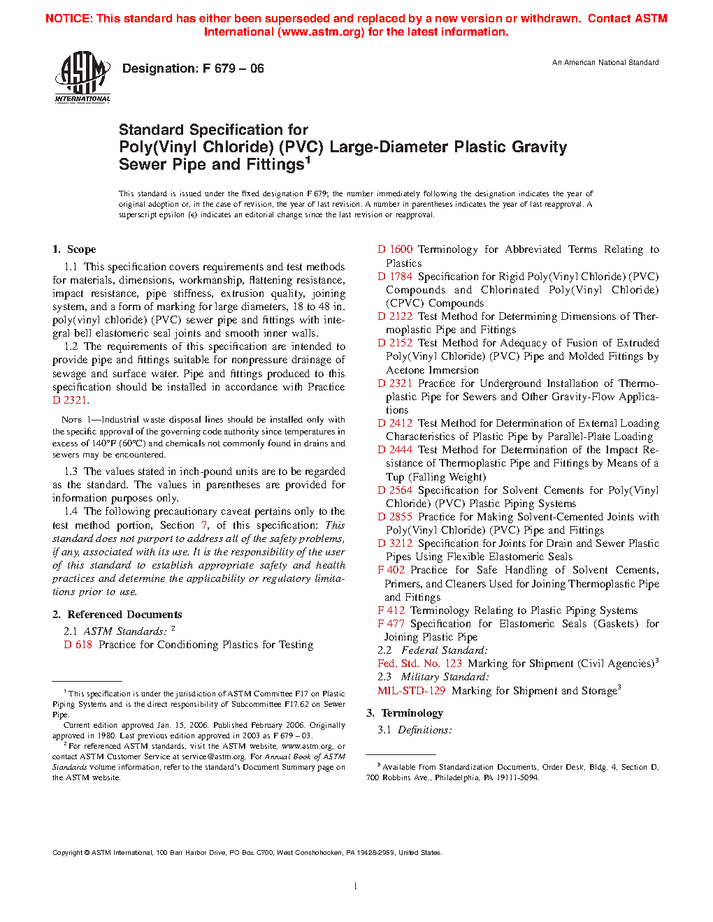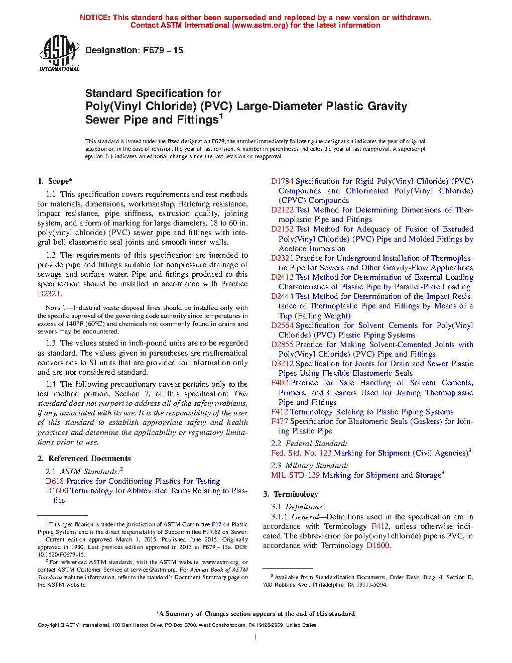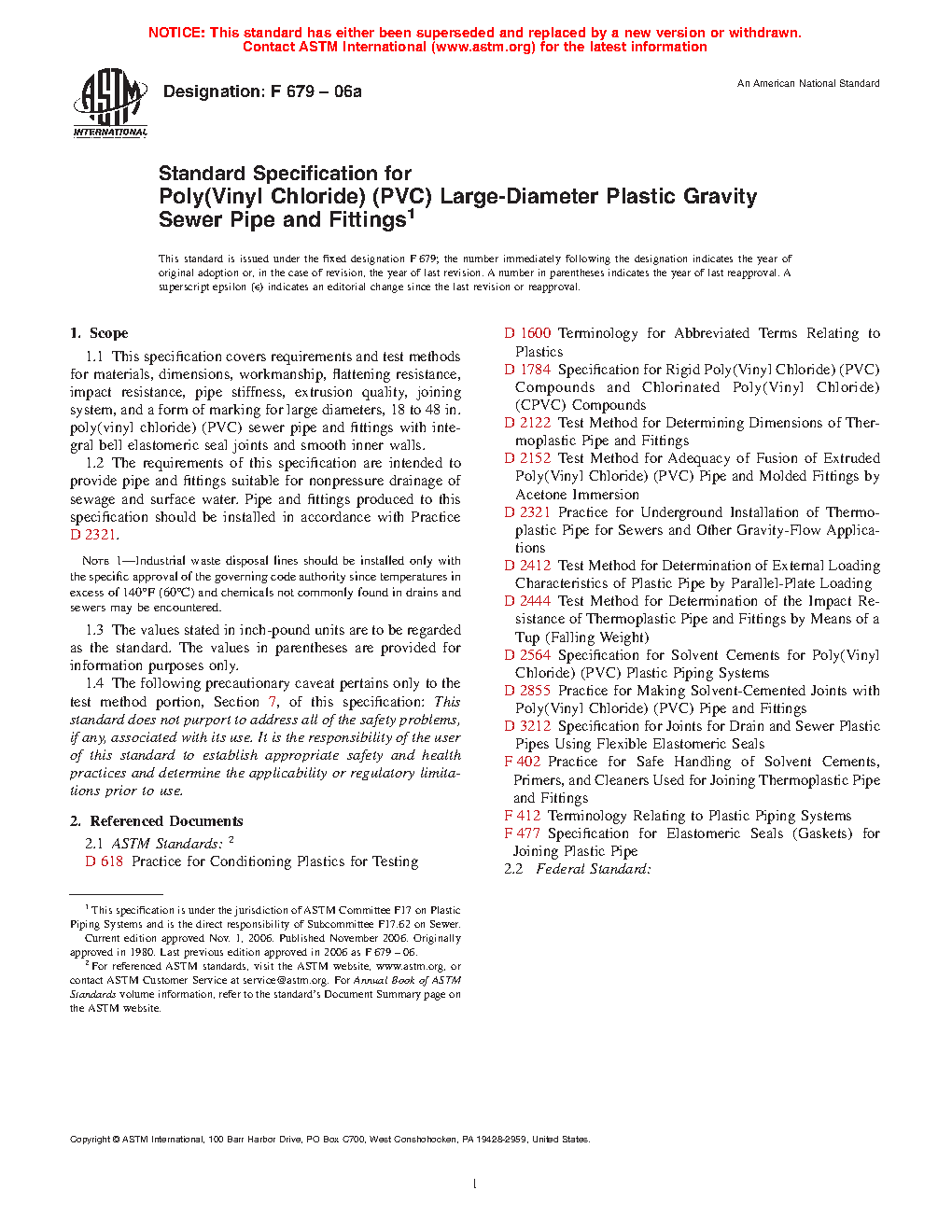 1.2 The requirements of this specification are intended to provide pipe and fittings suitable for nonpressure drainage of sewage and surface water. Pipe and fittings produced to this specification should be installed in accordance with Practice D2321.