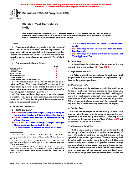 1.1 These test methods cover procedures for the testing of nails. The test or tests selected, and the requirements for compliance, will be as specified in the applicable product standard. Performance tests for nail withdrawal and lateral load capability are not included as they are covered by Test Methods D1761.