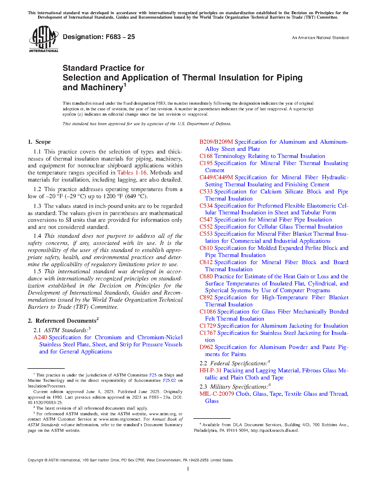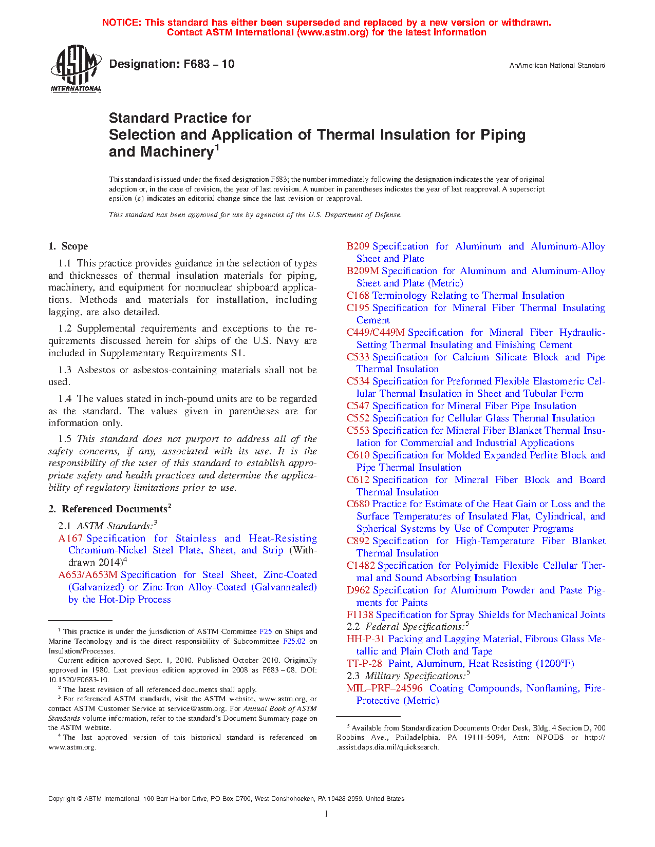 This practice provides the design and dimensional details required for the proper selection of the type of, and correct installation procedures for, thermal insulation materials suitable for use on piping, machinery, and equipment employed in nonnuclear shipboard applications. The insulation and lagging requirements for the removable covers of valves, fittings, flanges, and machinery or equipment, as well as the requirements for thermal insulating tape, are also detailed completely.